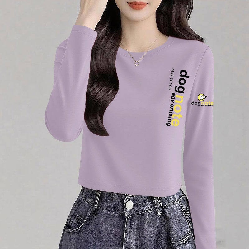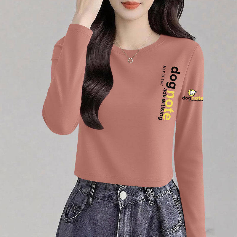 长袖 韩版 t恤女春秋季 休闲女士打底衫 简约上衣 时尚 100纯棉高腰短款