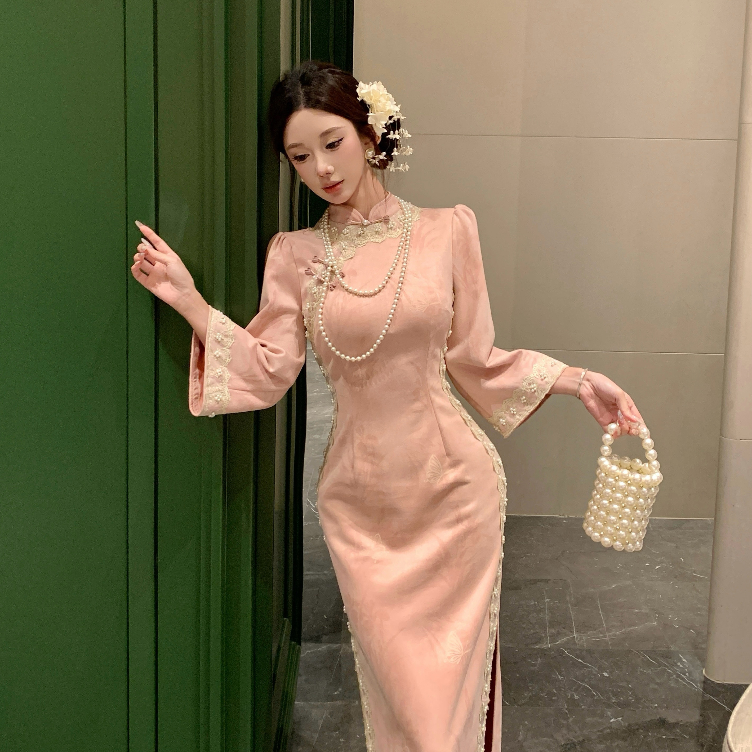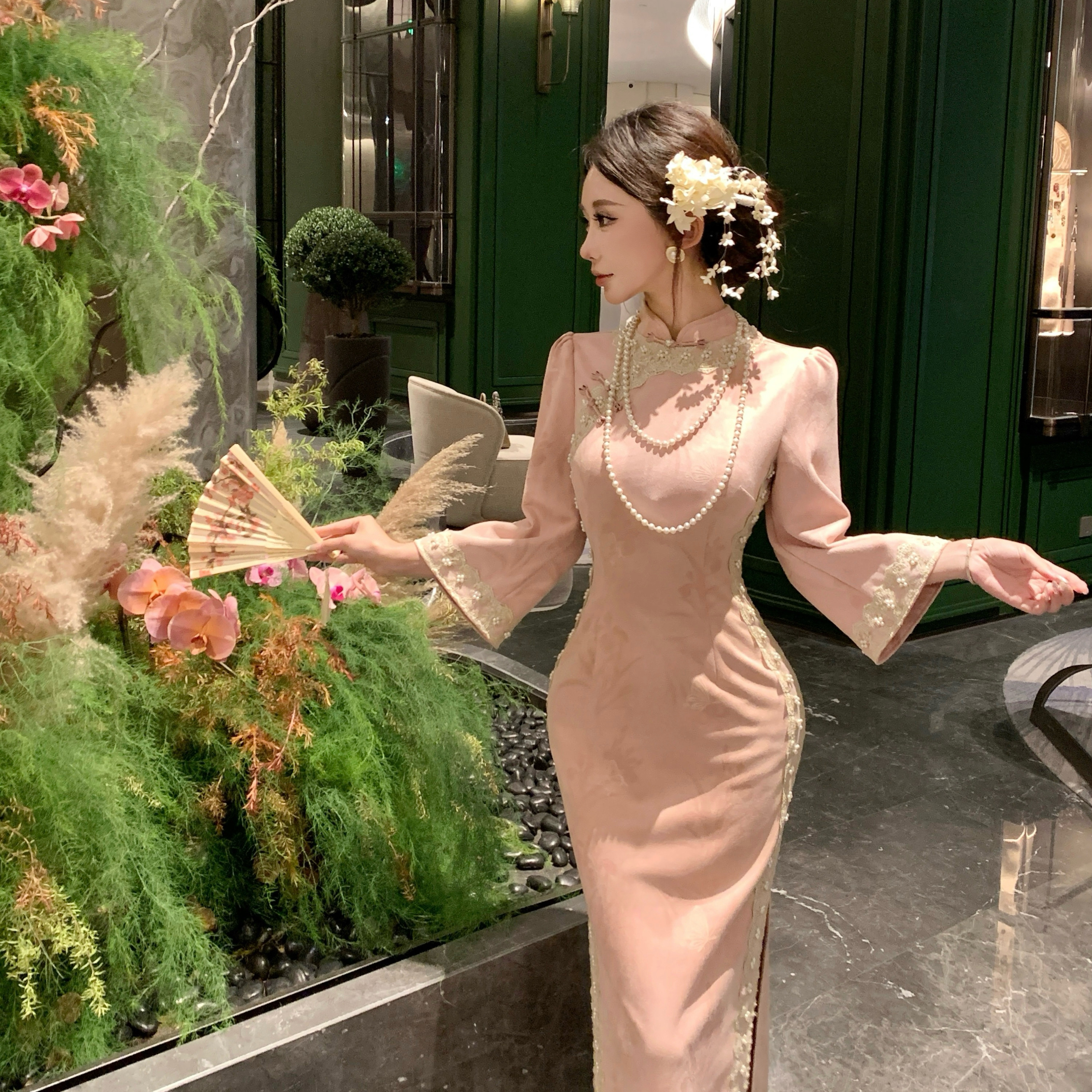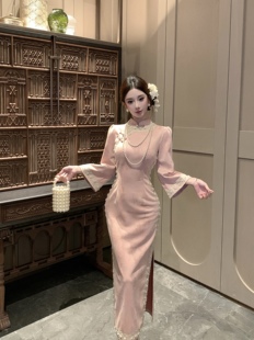 新中式 粉太太 国风气质秋冬温柔麂皮高级珠链蕾丝改良旗袍连衣裙