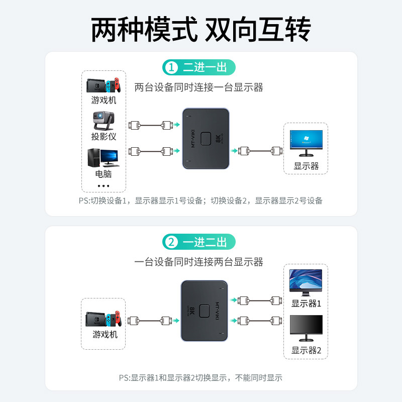 高清hdmi切换器二进一出2进1出8K双向转换4k电脑笔记本ps游戏机共享显示器高清线一拖二 HD121H 迈拓维矩