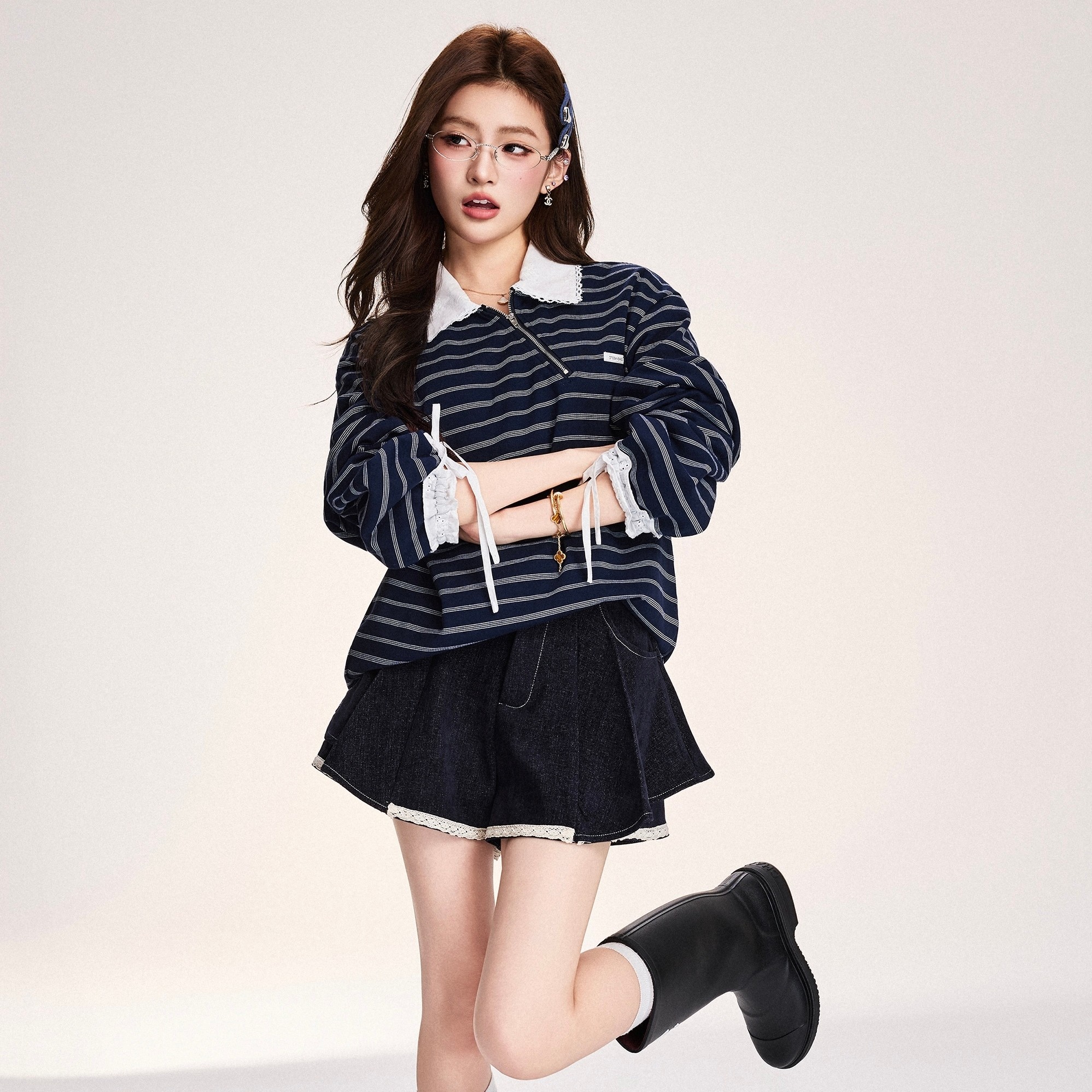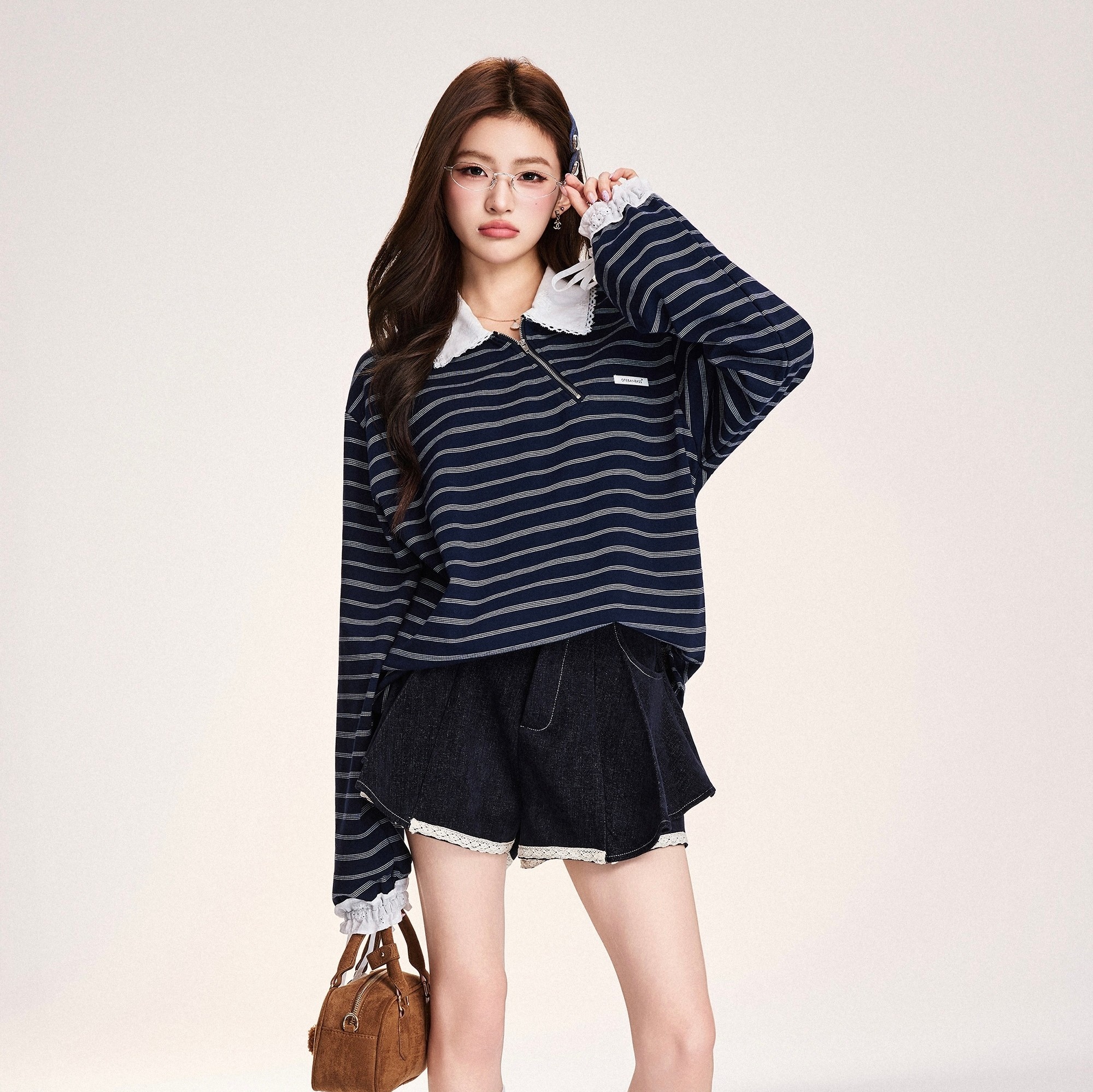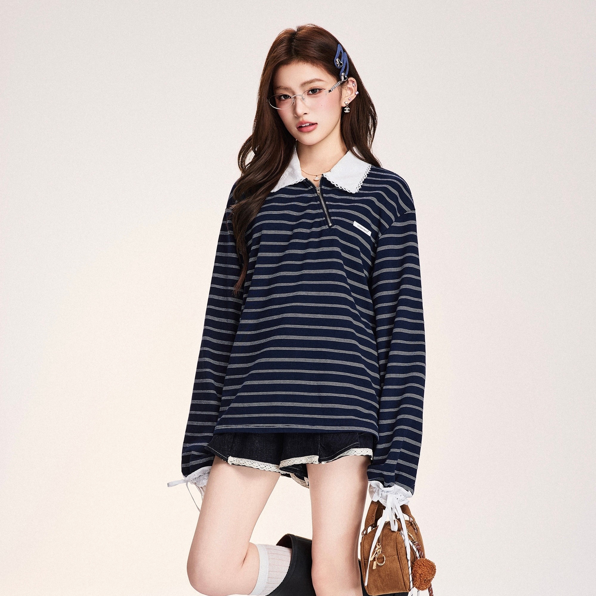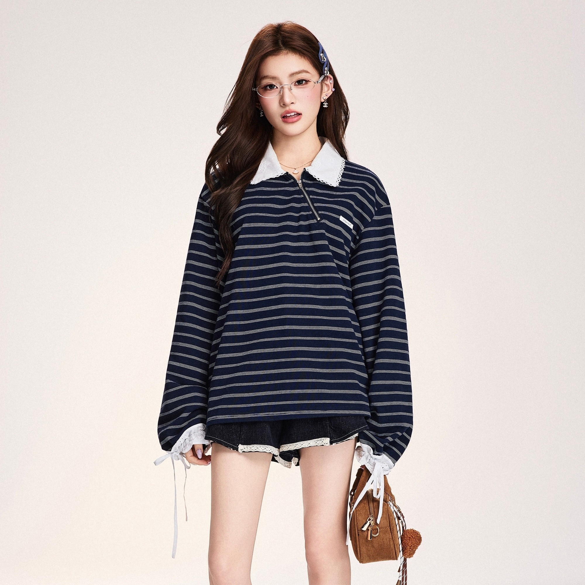 OTEBANBASS25SS刺绣蕾丝拼接袖 卫衣T恤 口上衣女翻领条纹撞色长袖