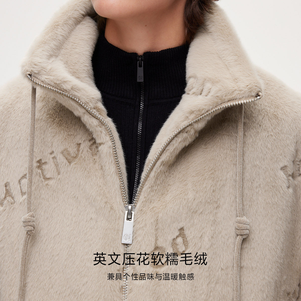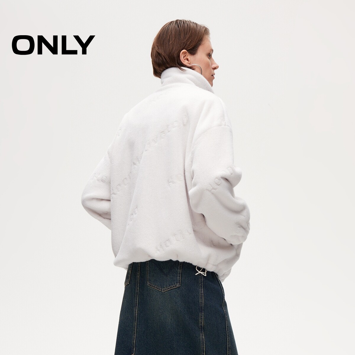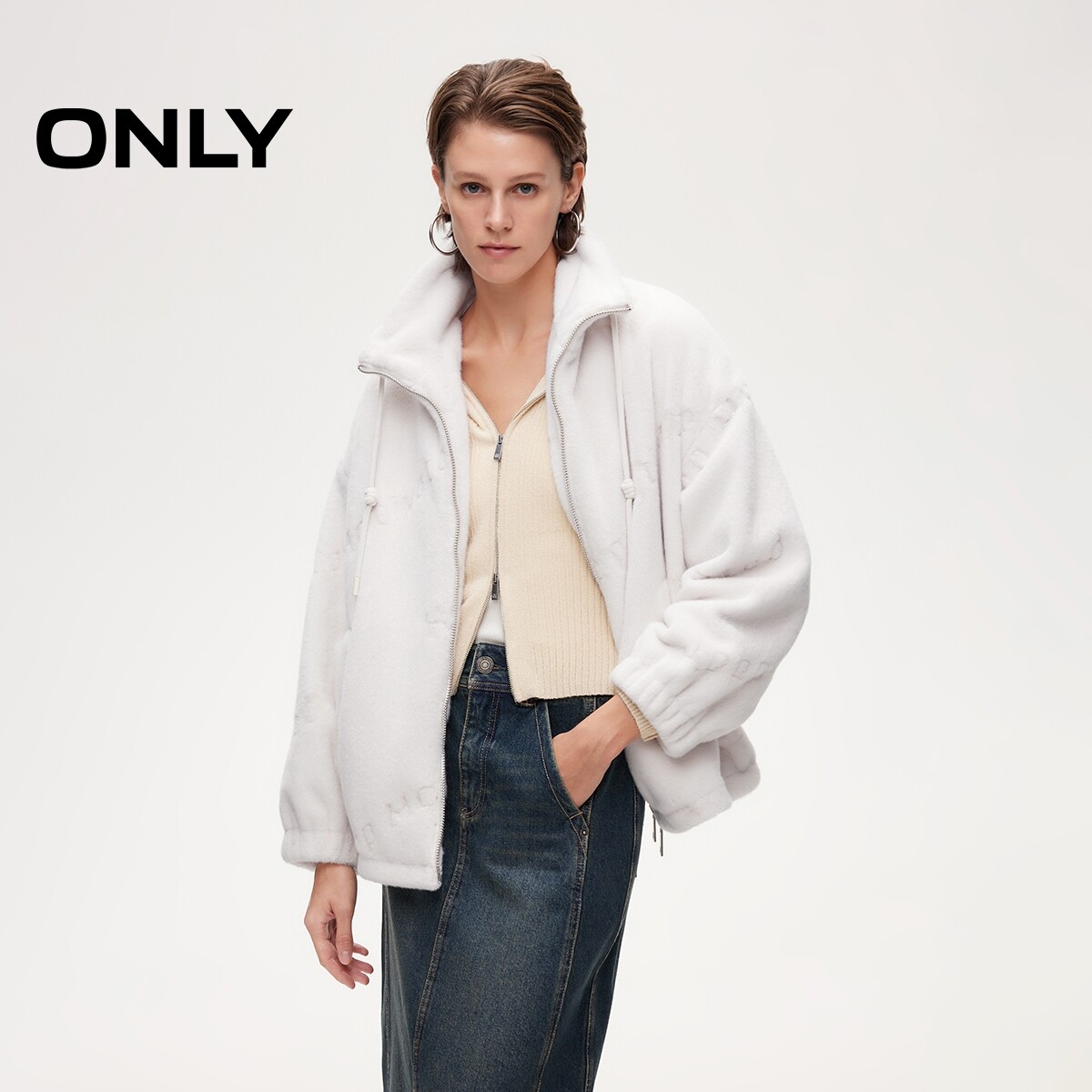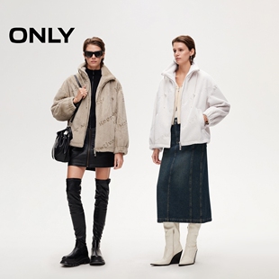 ONLY可调弹力抽绳宽松毛绒英文压花可调节下摆棉服女