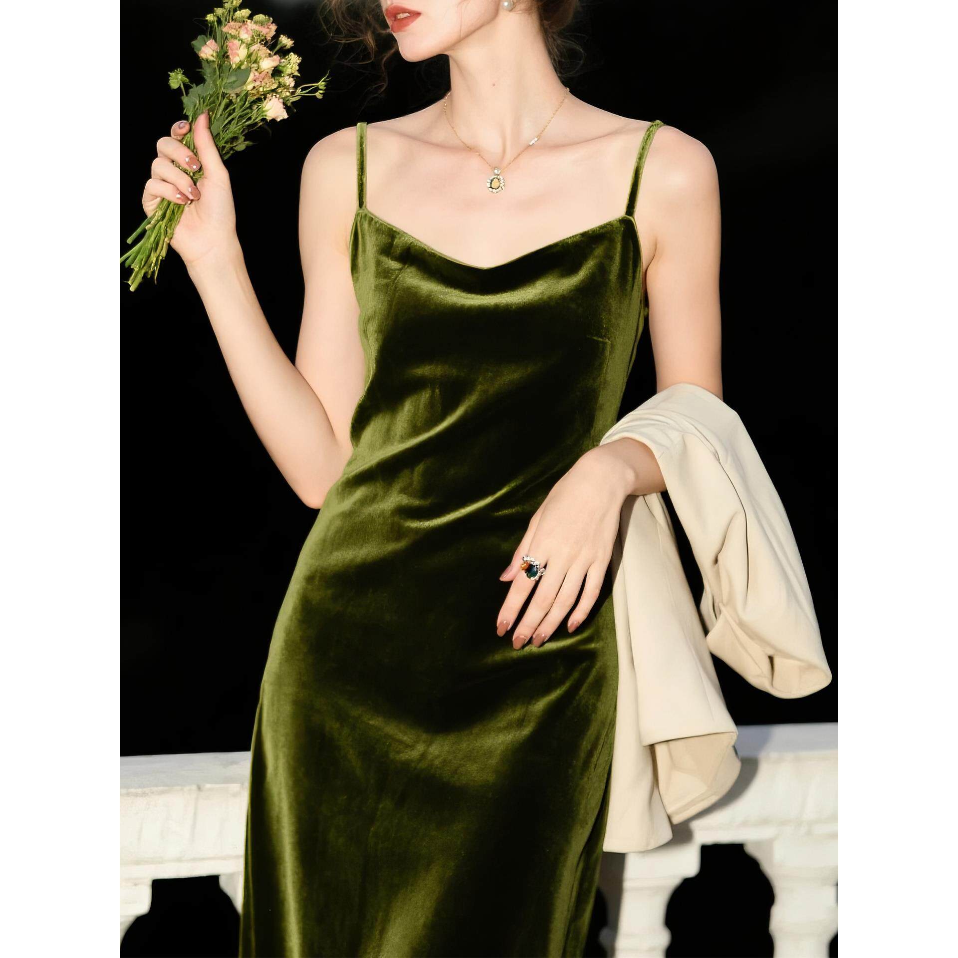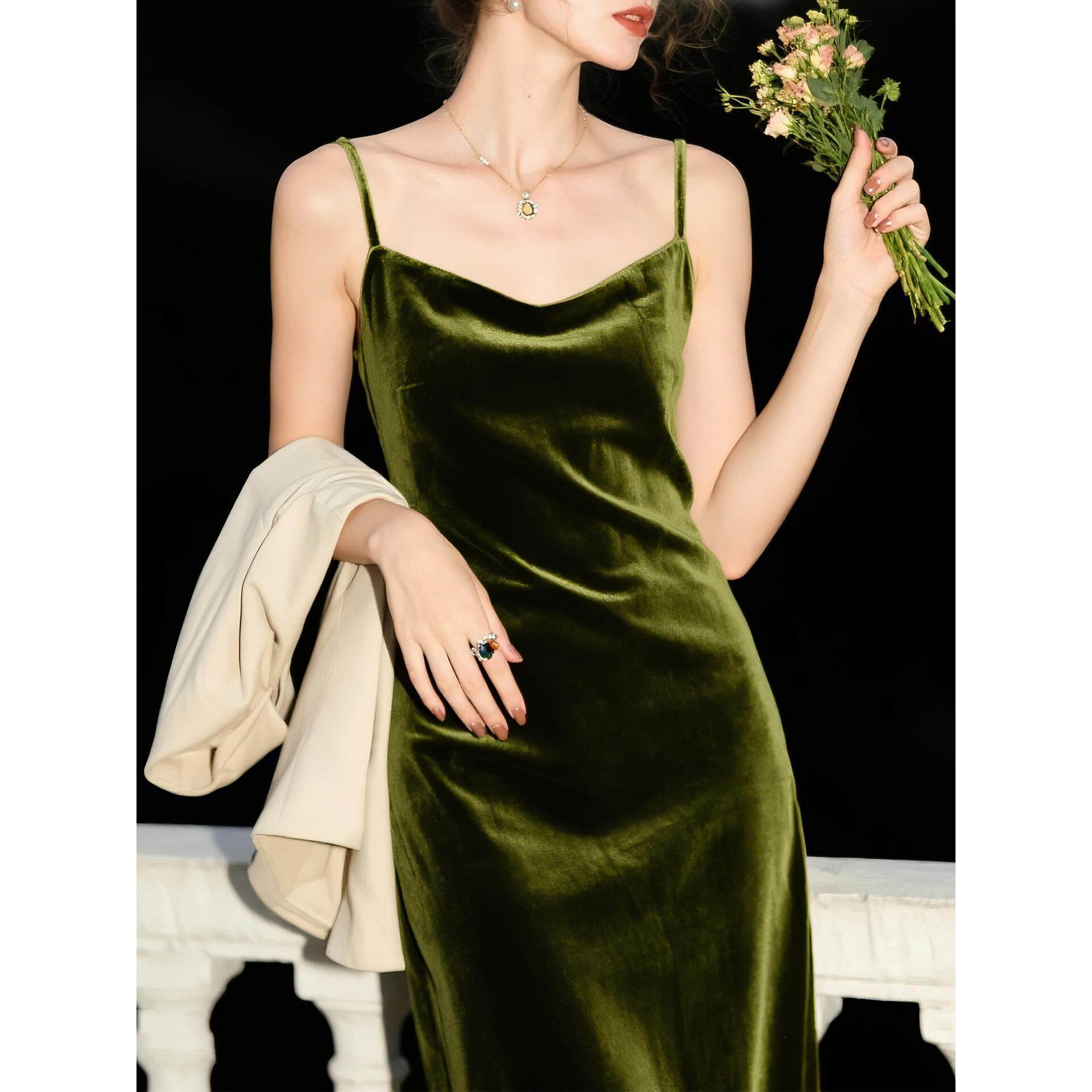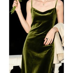 橄榄绿荡领丝绒吊带连衣裙春秋新款 复古高级感显瘦包臀裙 法式