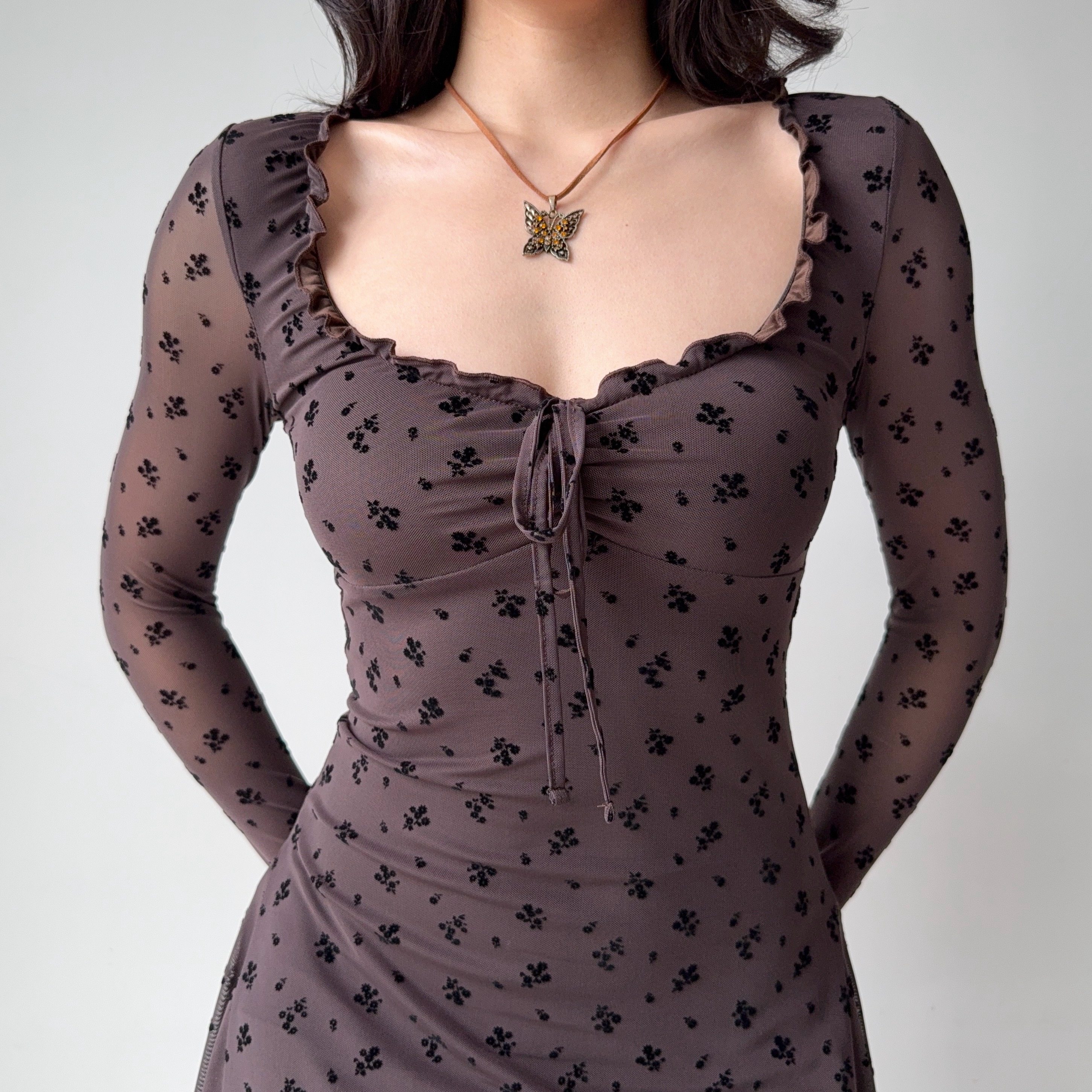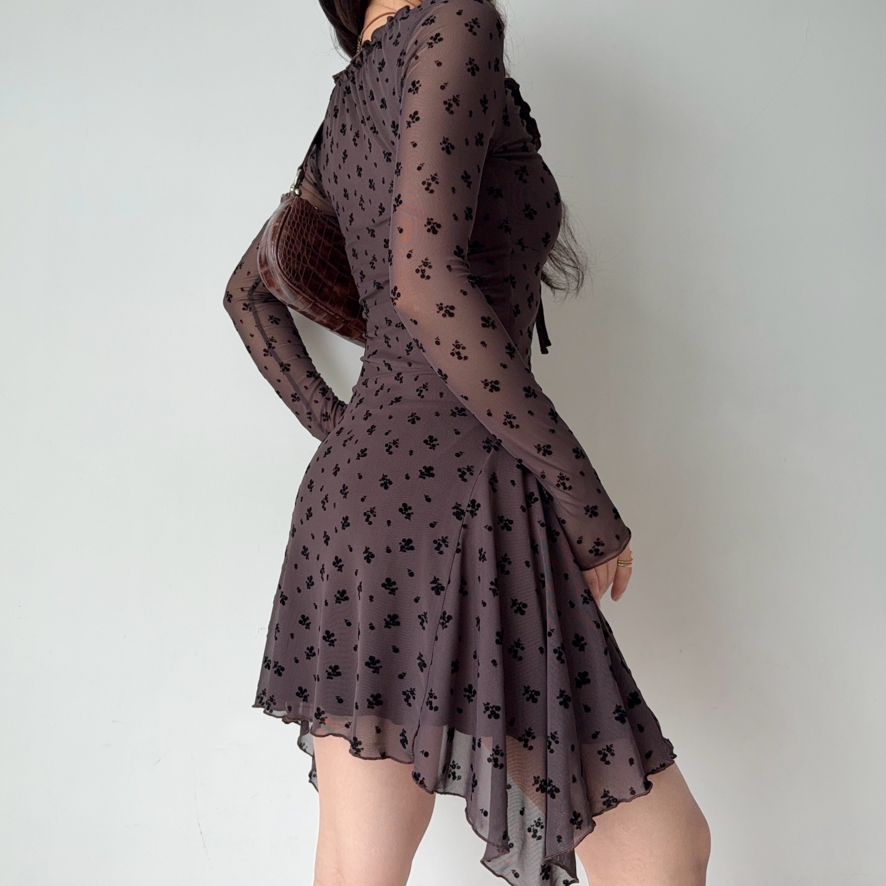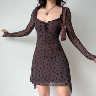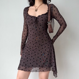 连衣裙不规则a字短裙女秋 自制欧美风植绒网纱U领长袖 Girl