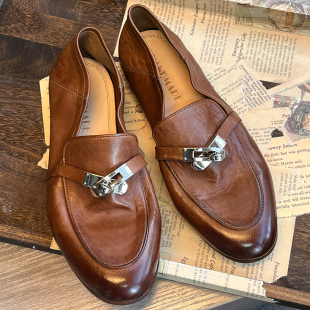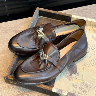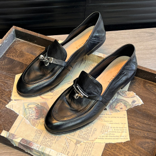 做旧马衔扣一脚蹬懒人 锁扣小皮鞋 猫儿家 进口水洗马皮手工乐福鞋