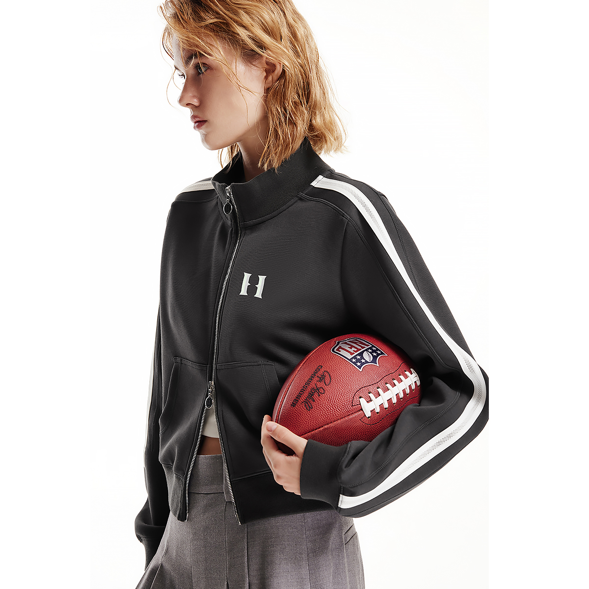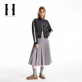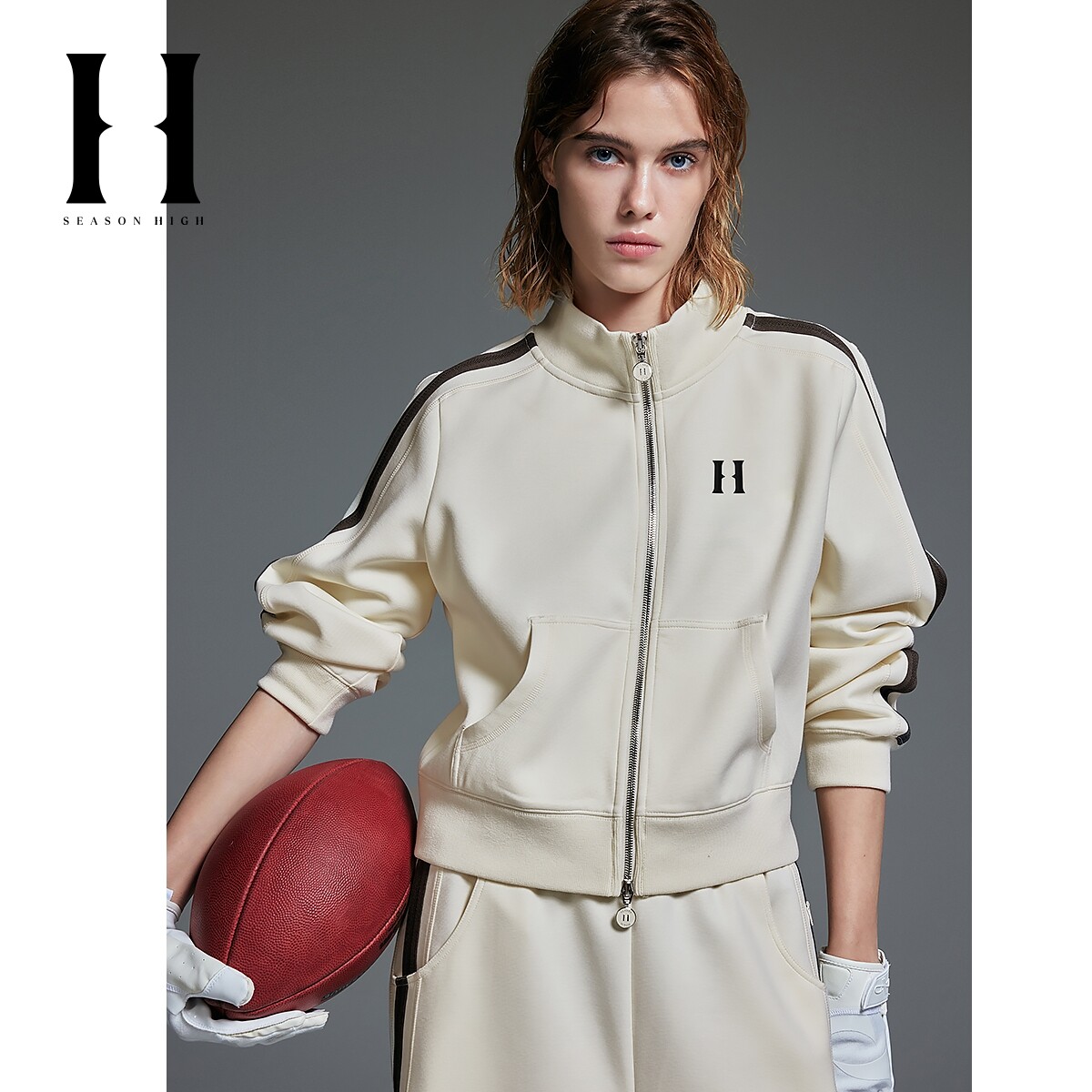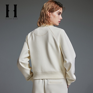 SEASONHIGH春季 女士立领卫衣双头拉链字母刺绣织带拼接上衣 新款