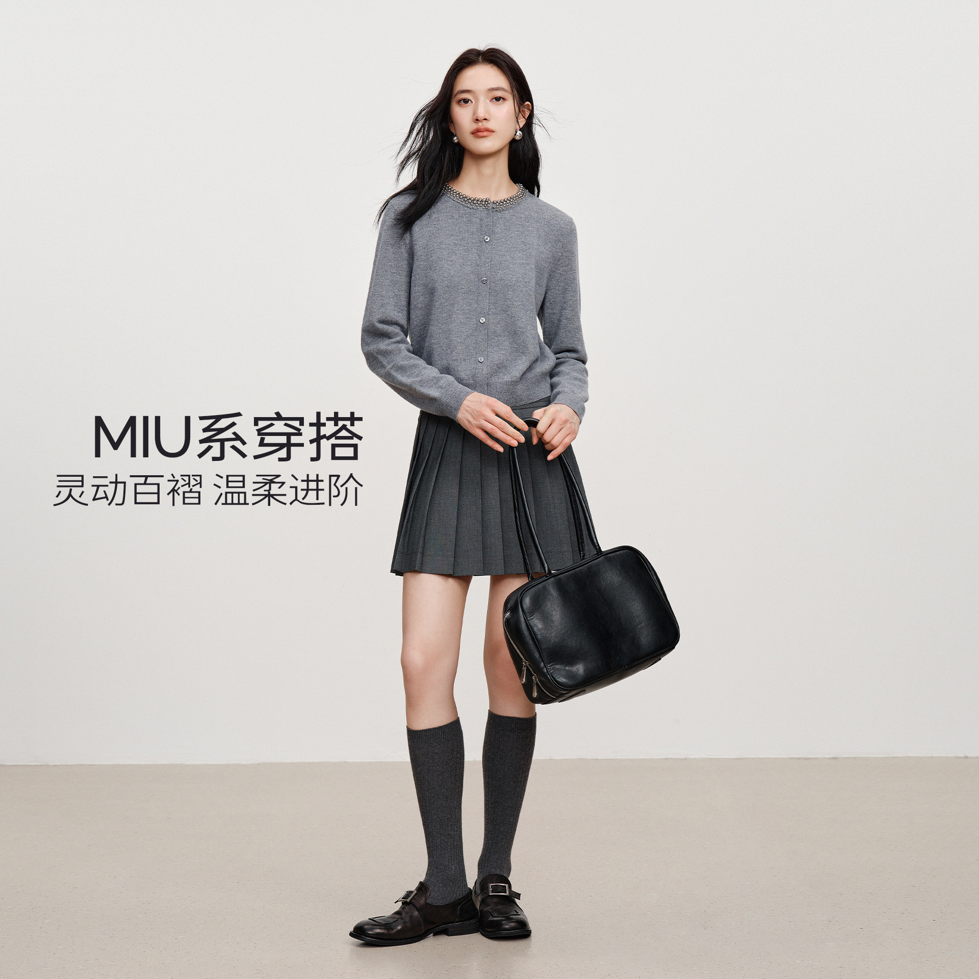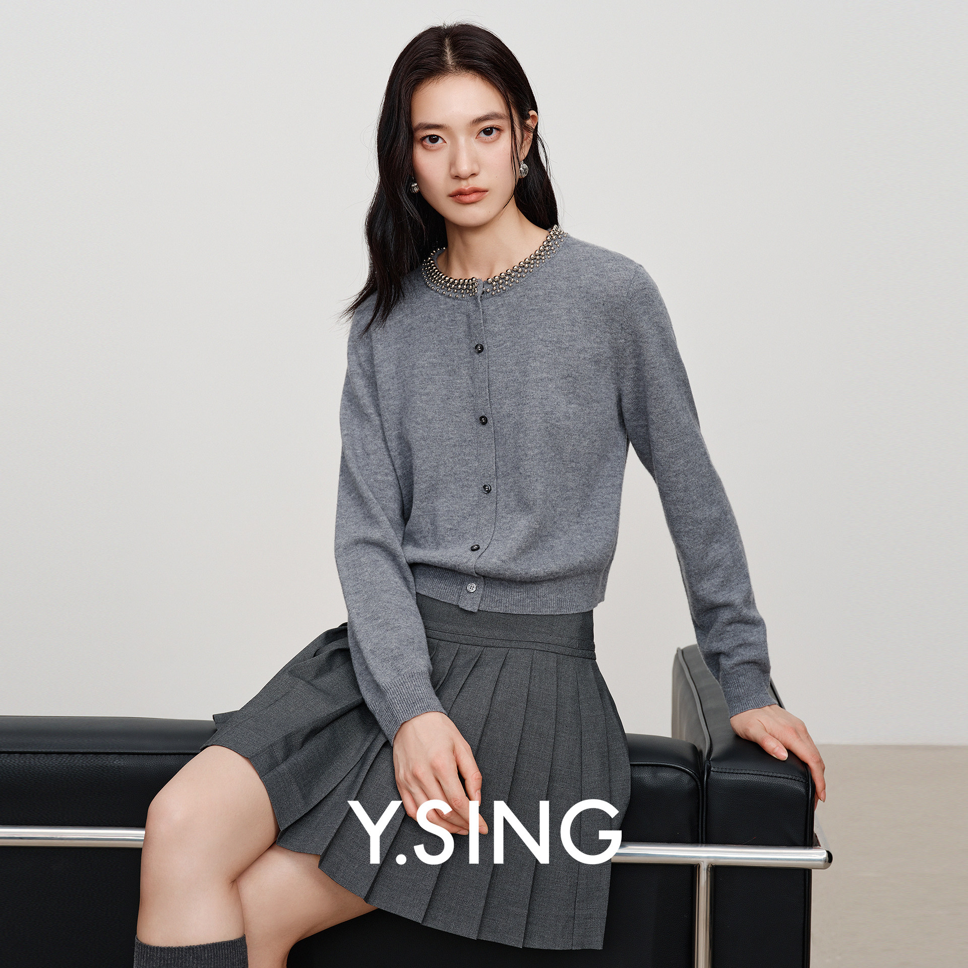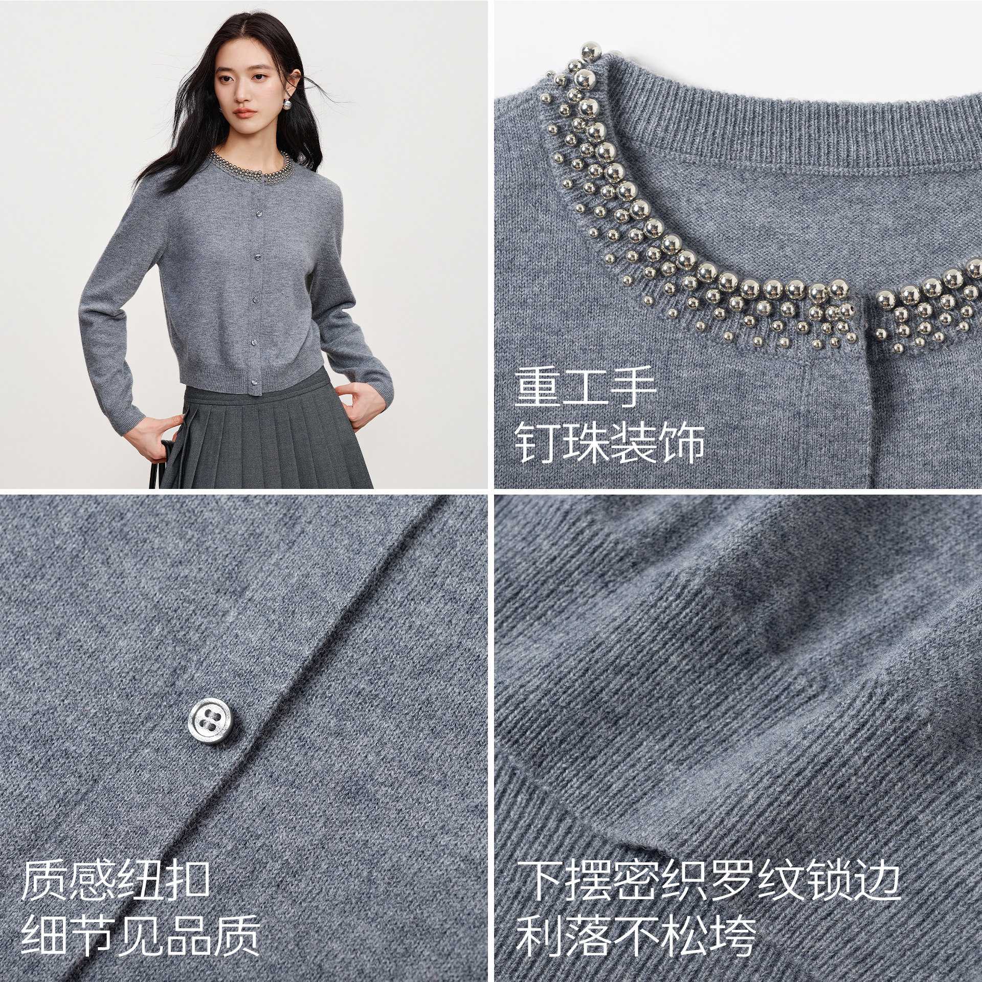 韩系氛围感灰色上衣 新款 衣香丽影全羊毛钉珠针织开衫 女2025秋冬装