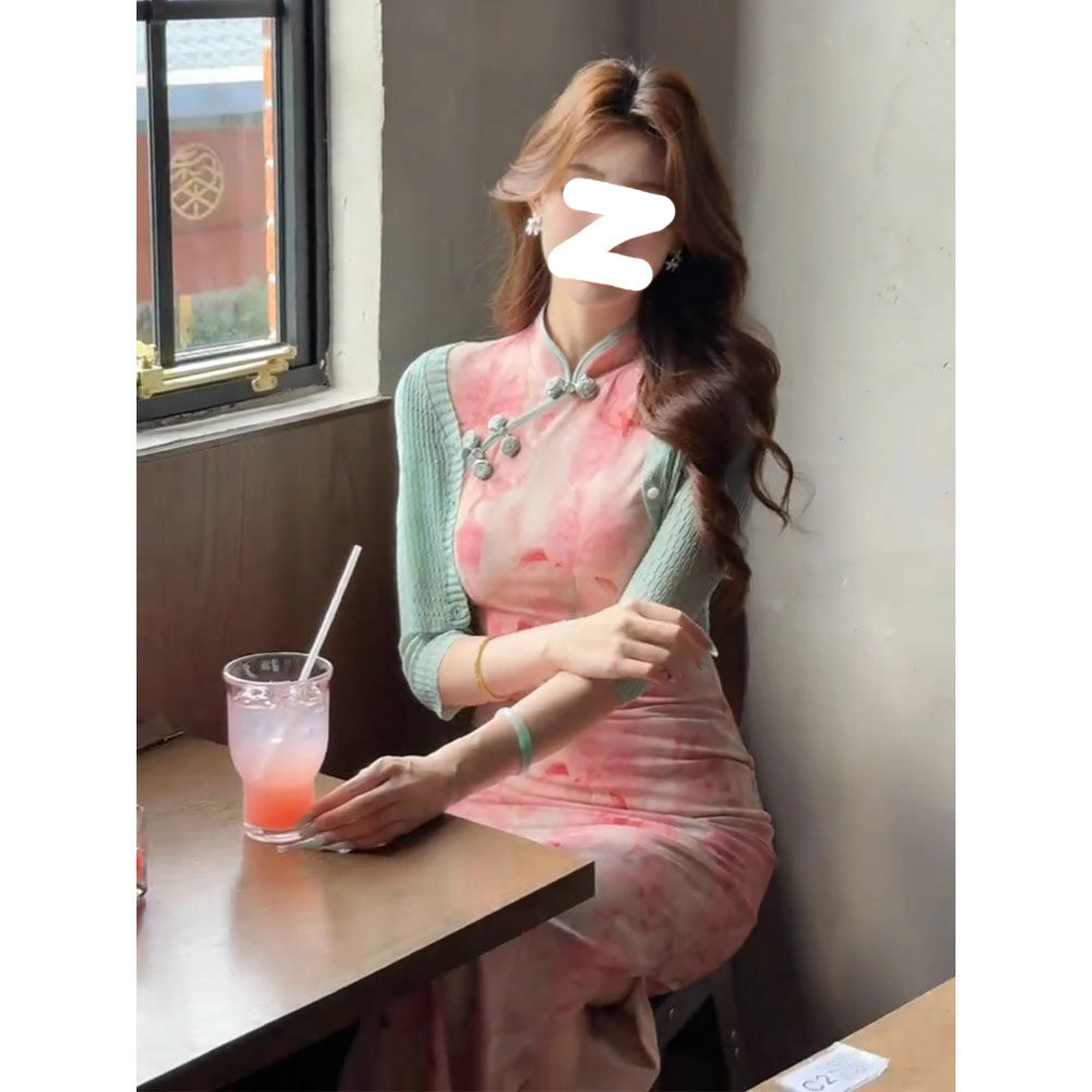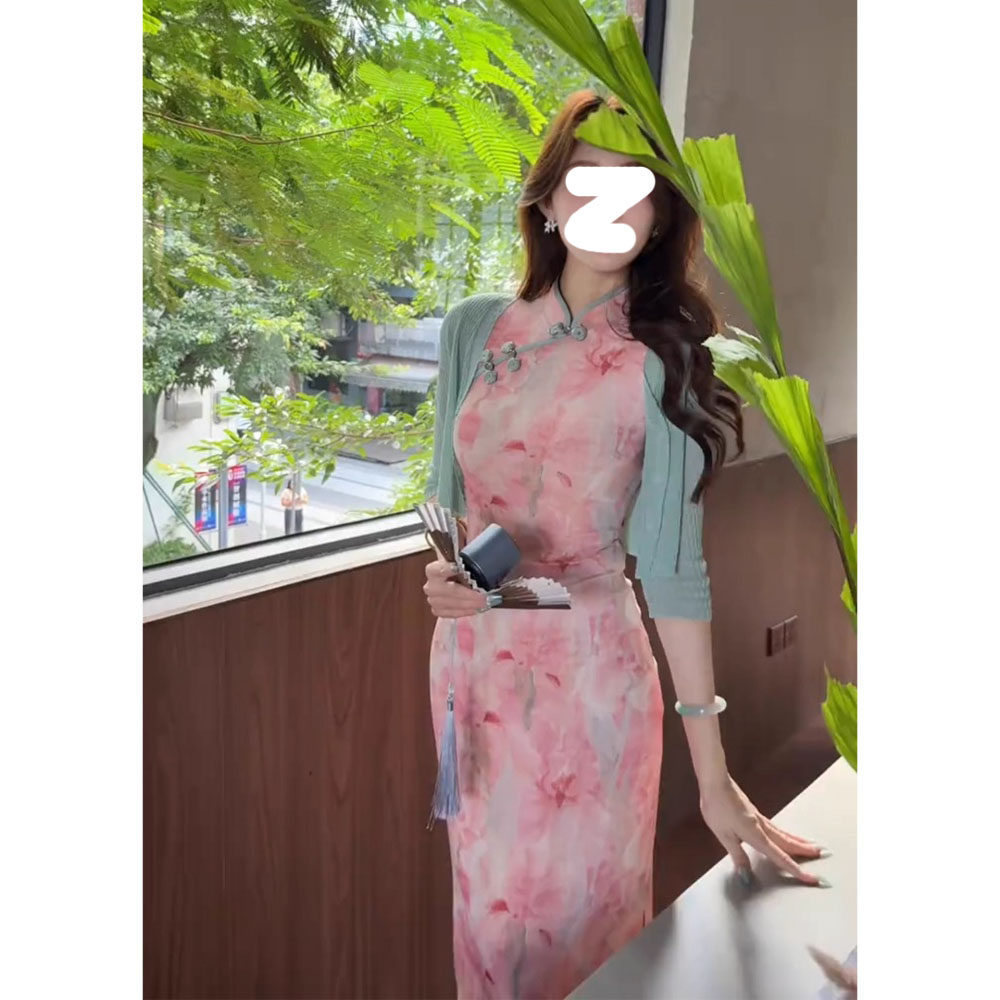 改良版 微胖时尚 旗袍无袖 纯色开衫 优雅两件套 印花连衣裙新款 新中式