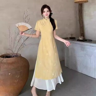 夏季 连衣裙女装 高级感雪纺旗袍裙胖MM遮肚显瘦裙子 国风新中式 大码