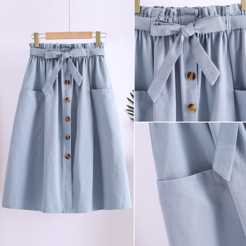 宽松高腰中长裙森女系新款 单排扣半身裙夏季 少女裙子 新款 2023夏装