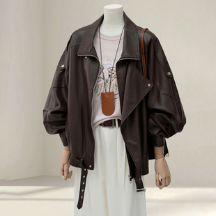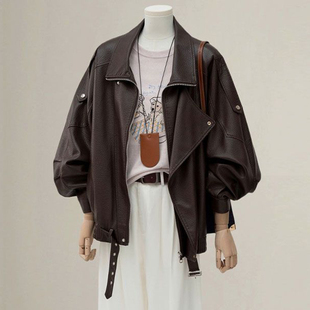 美式 大码 皮衣外套女春季 胖mm咖色宽松显瘦开衫 高街夹克上衣潮 女装