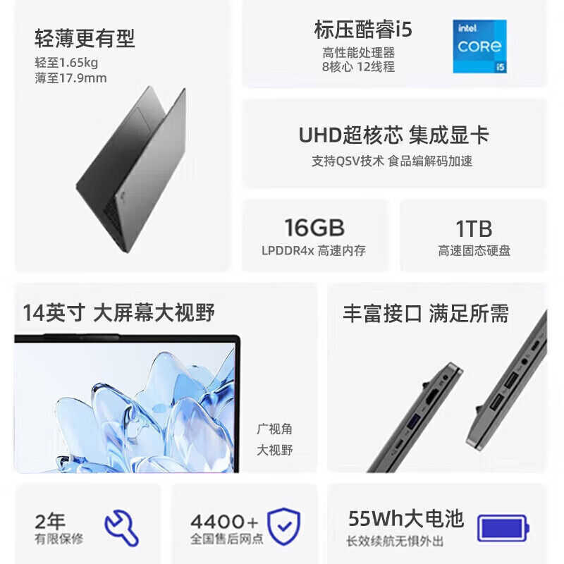 联想笔记本电脑2025新款 来酷学生设计酷睿i5办公游戏轻薄本14寸