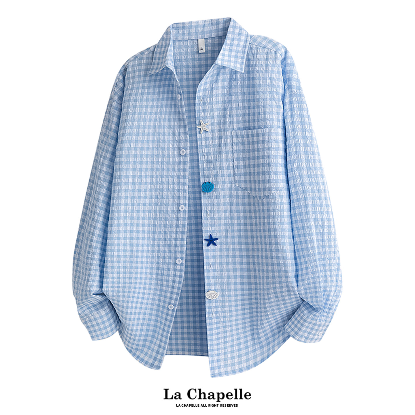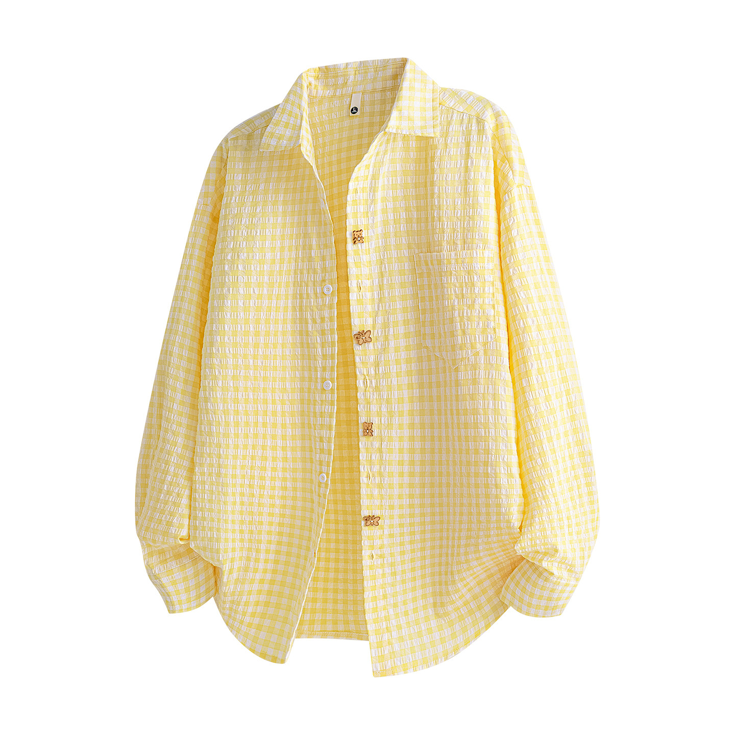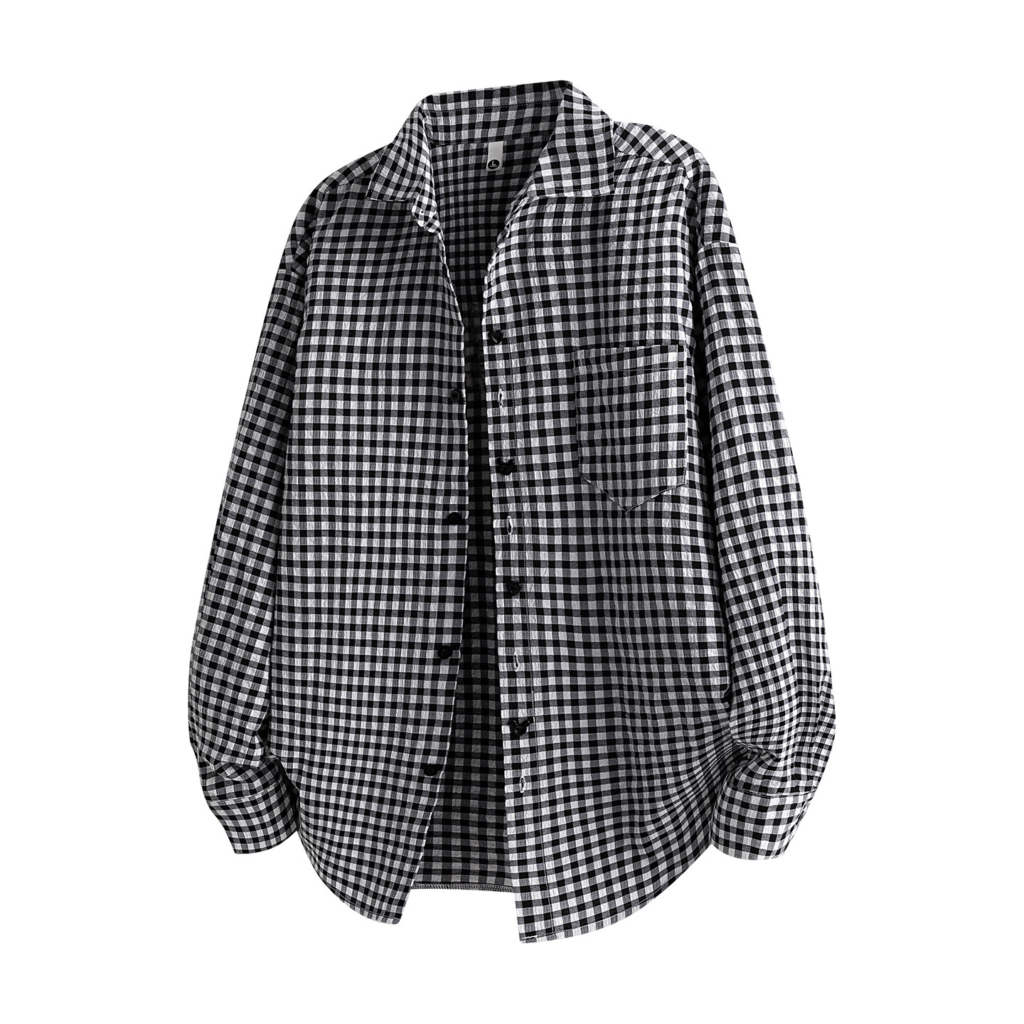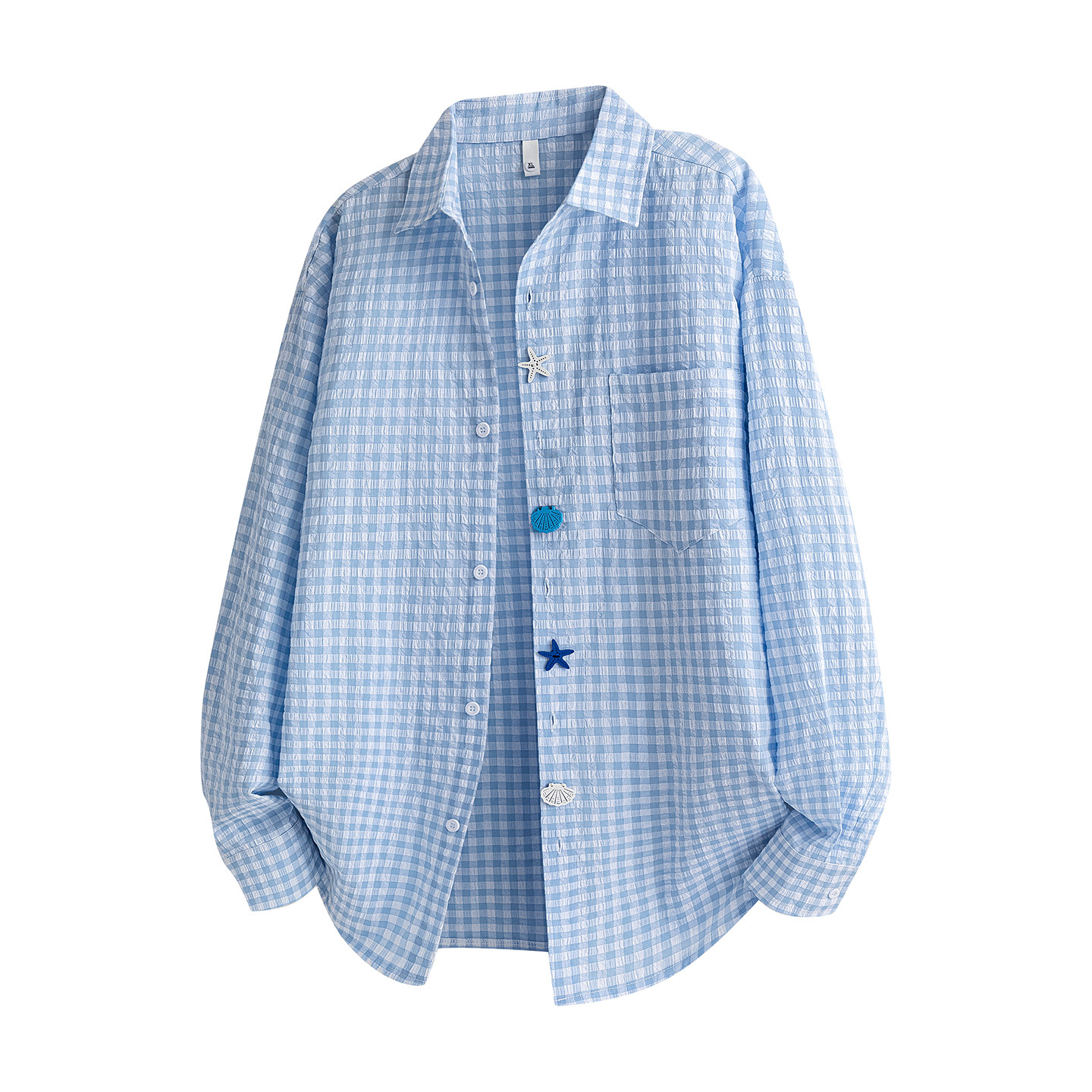 趣味纽扣设计泡泡纱衬衣外套男女 秋季 MSCS多巴胺格子长袖 衬衫