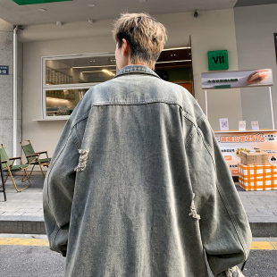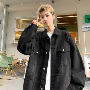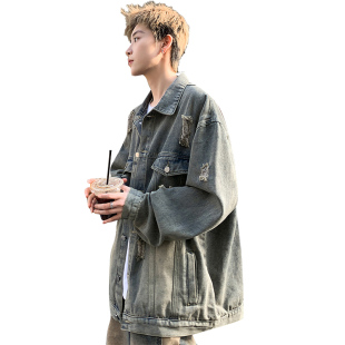 2025美式 痞帅感水洗破洞宽松夹克男潮流衣服 复古牛仔外套男春秋季
