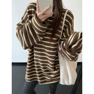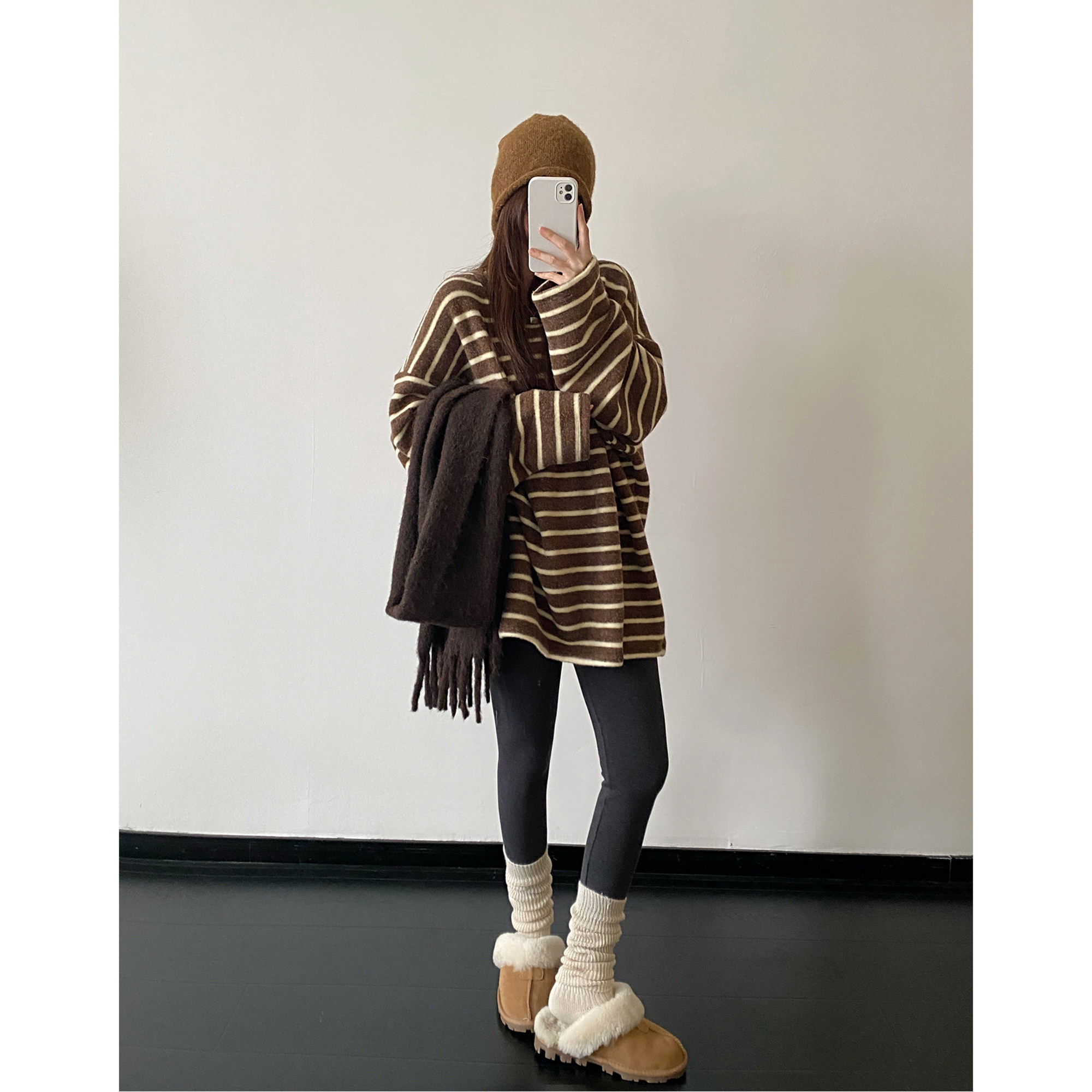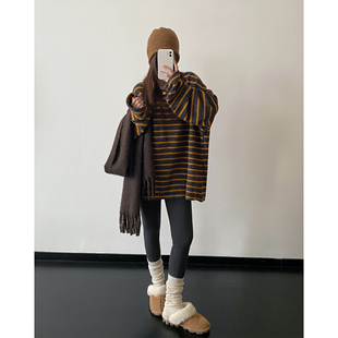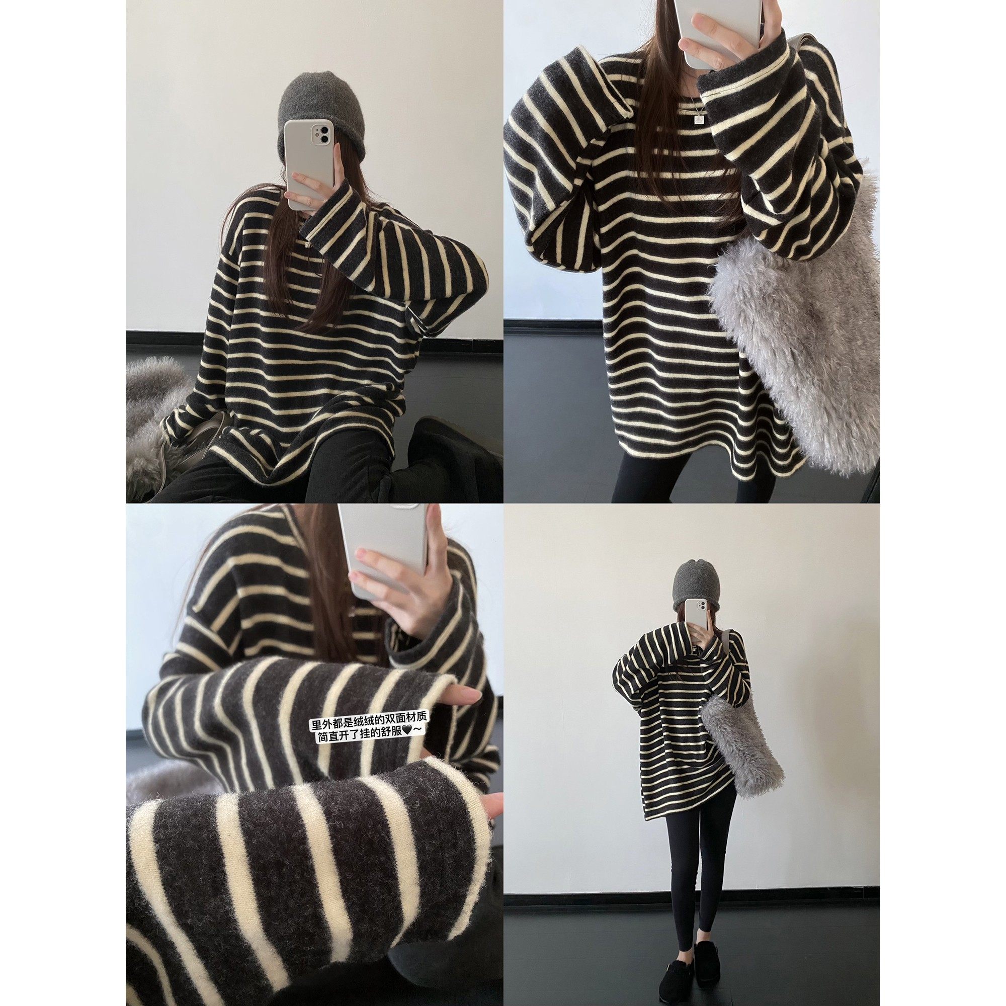 sun柚 针织慵懒风圆领百搭T恤 懒人条纹糯叽叽撞色磨毛感上衣