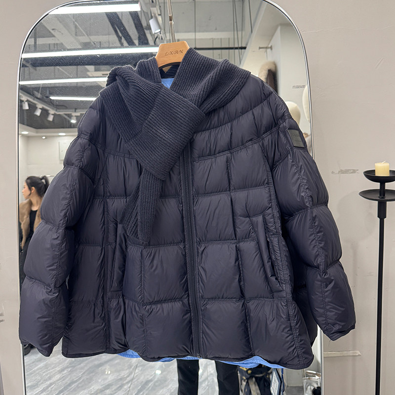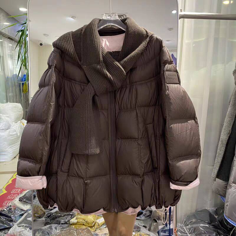 欧货2025冬休闲百搭毛线围脖90白鸭绒羽绒服女中长款 连帽显瘦外套