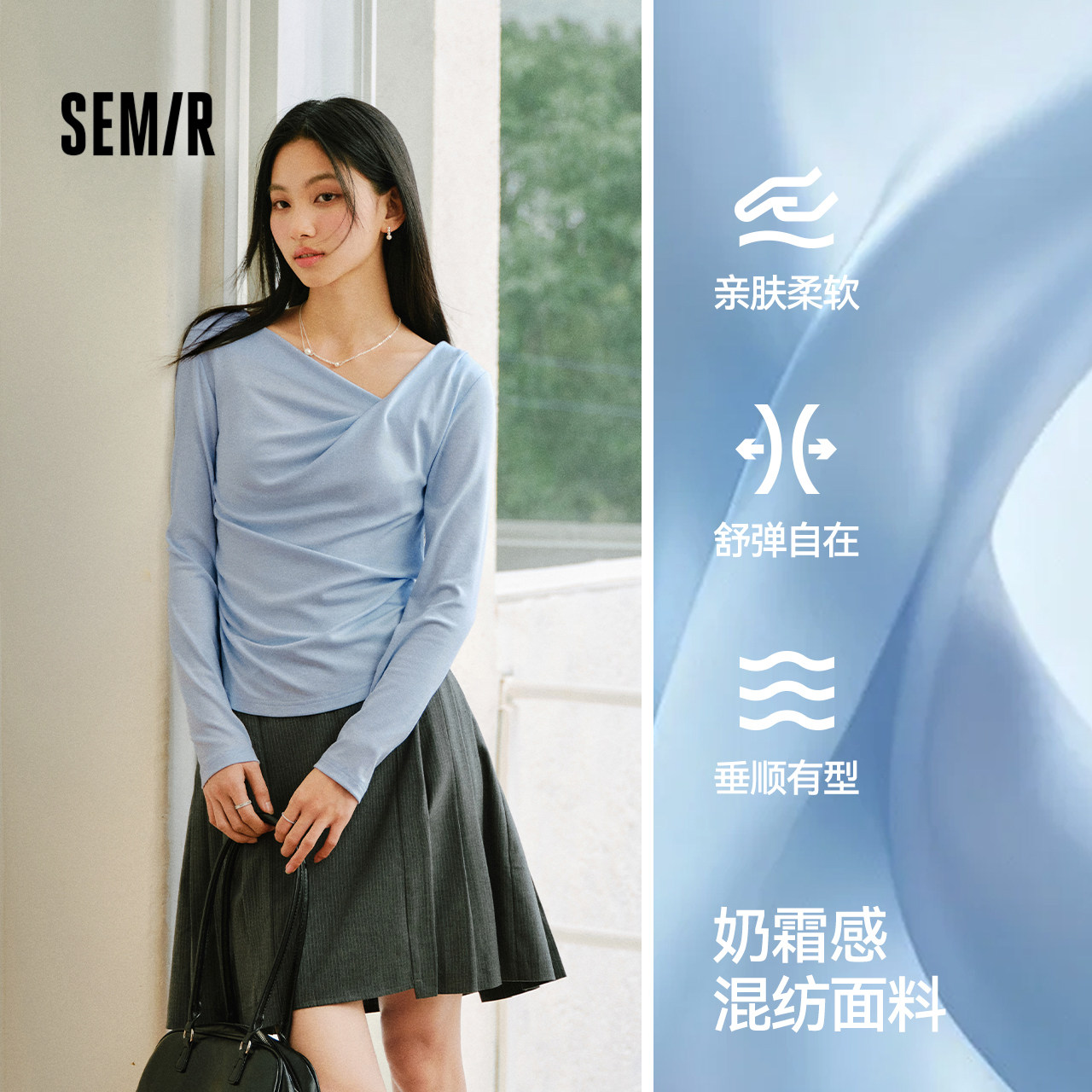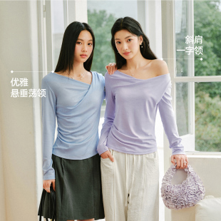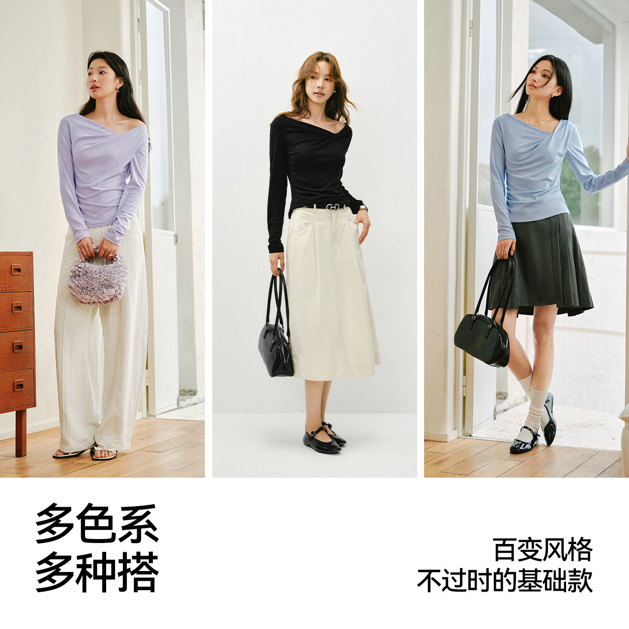 不对称荡领斜肩露肩紧身纯色2026新款 短款 上衣 T恤女春季 森马长袖