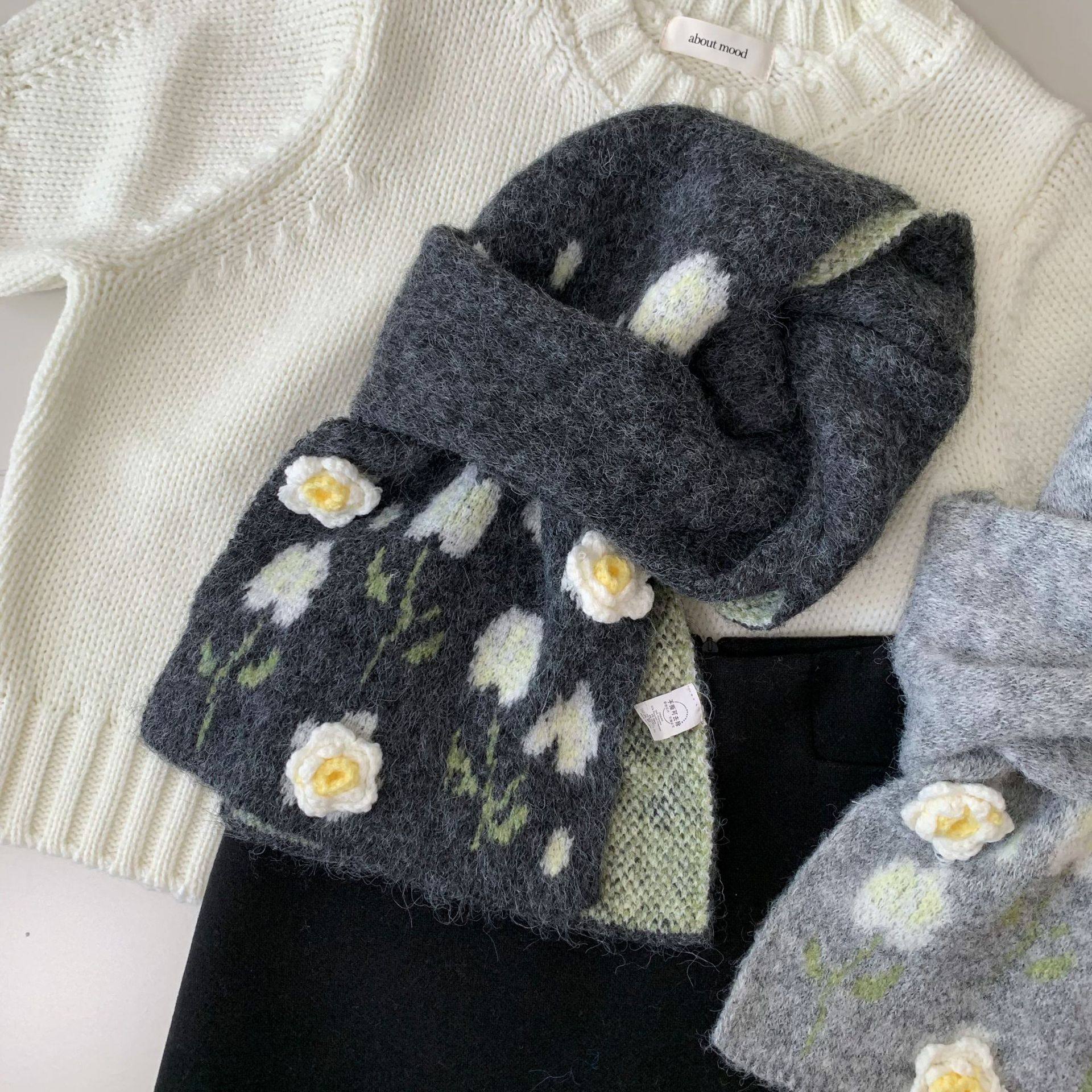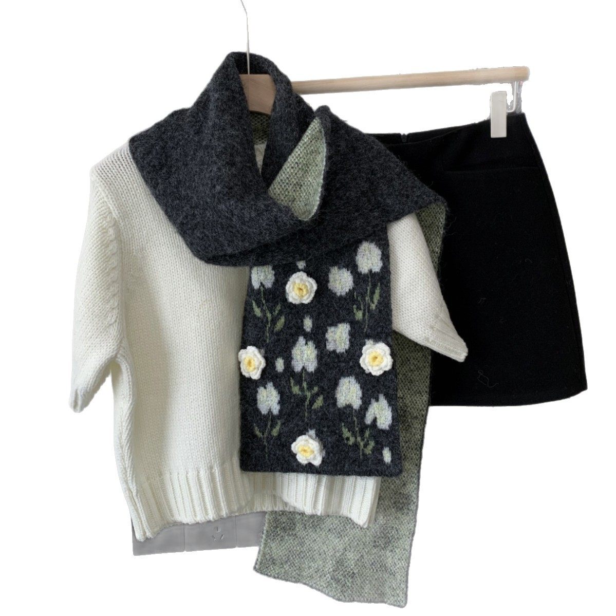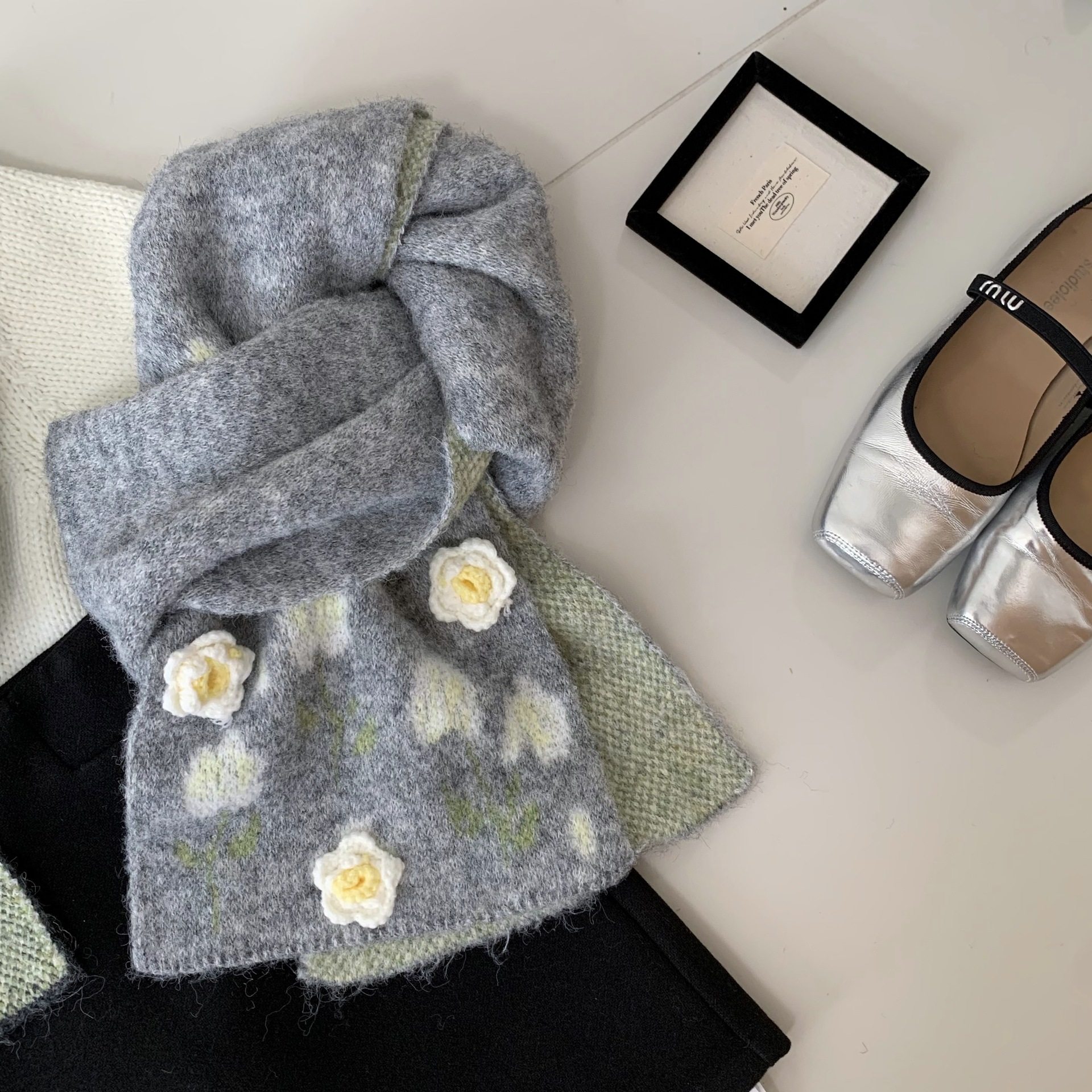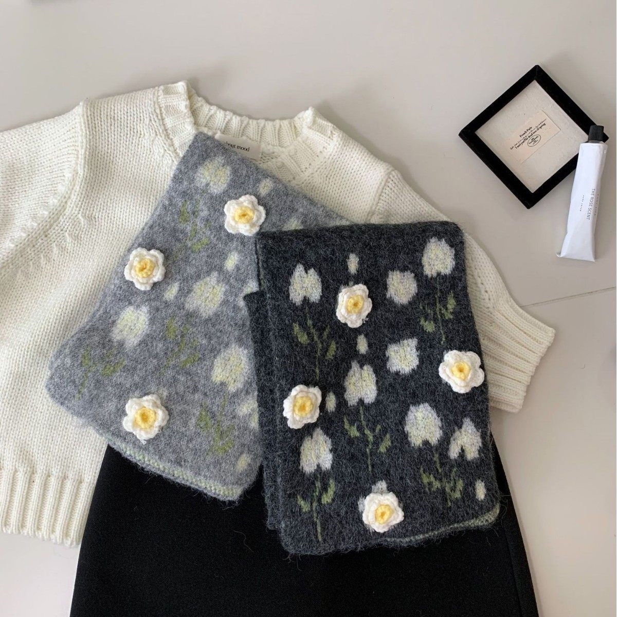 原创手工重磅系列 25秋冬立体山茶花针织韩系少女羊毛围巾围脖女
