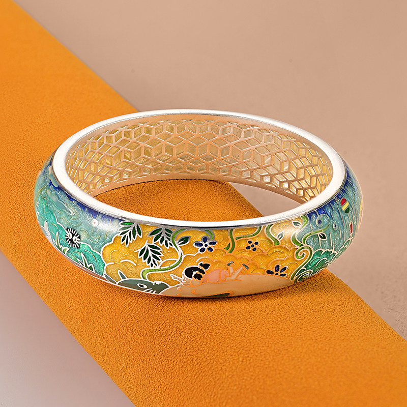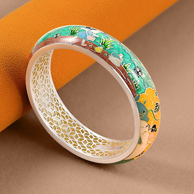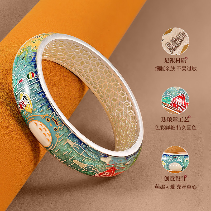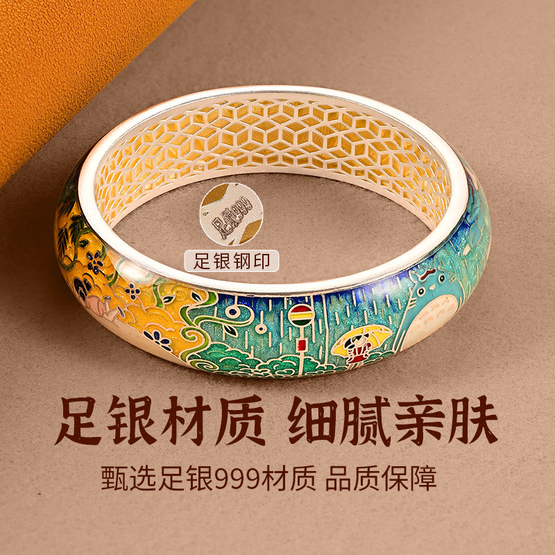 银千造 龙猫足银999空心闭口景泰蓝银手镯国风珐琅彩纯银手环女款