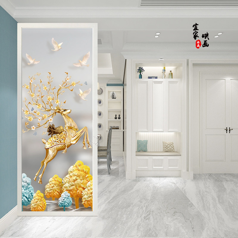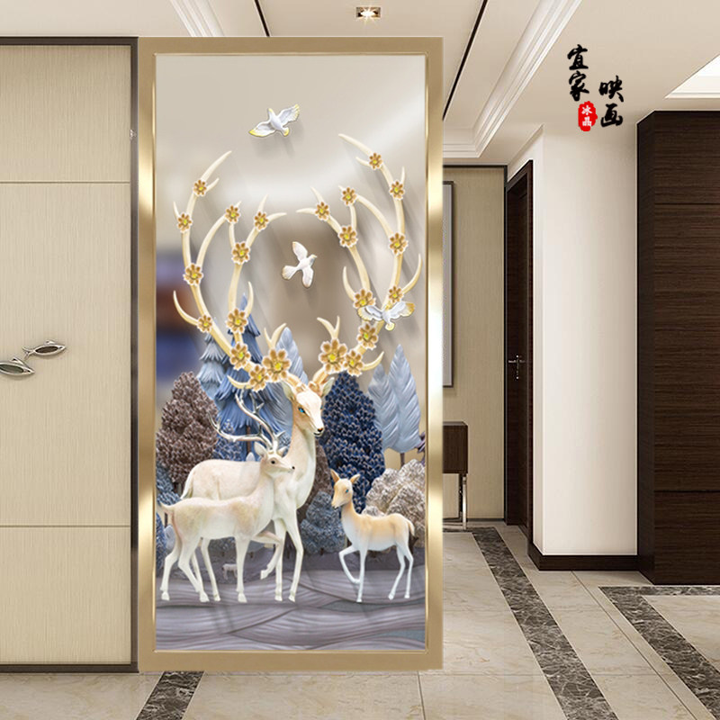 新中式 麋鹿彩绘艺术玻璃屏风隔断背景墙酒柜N磨砂透光双面入户玄