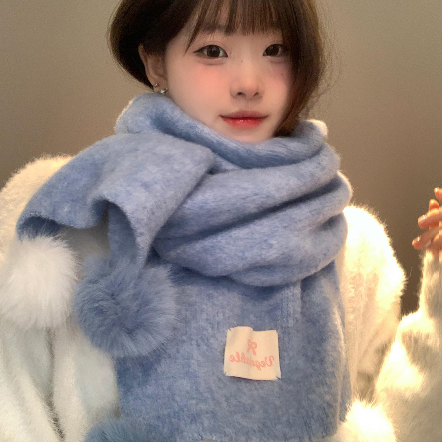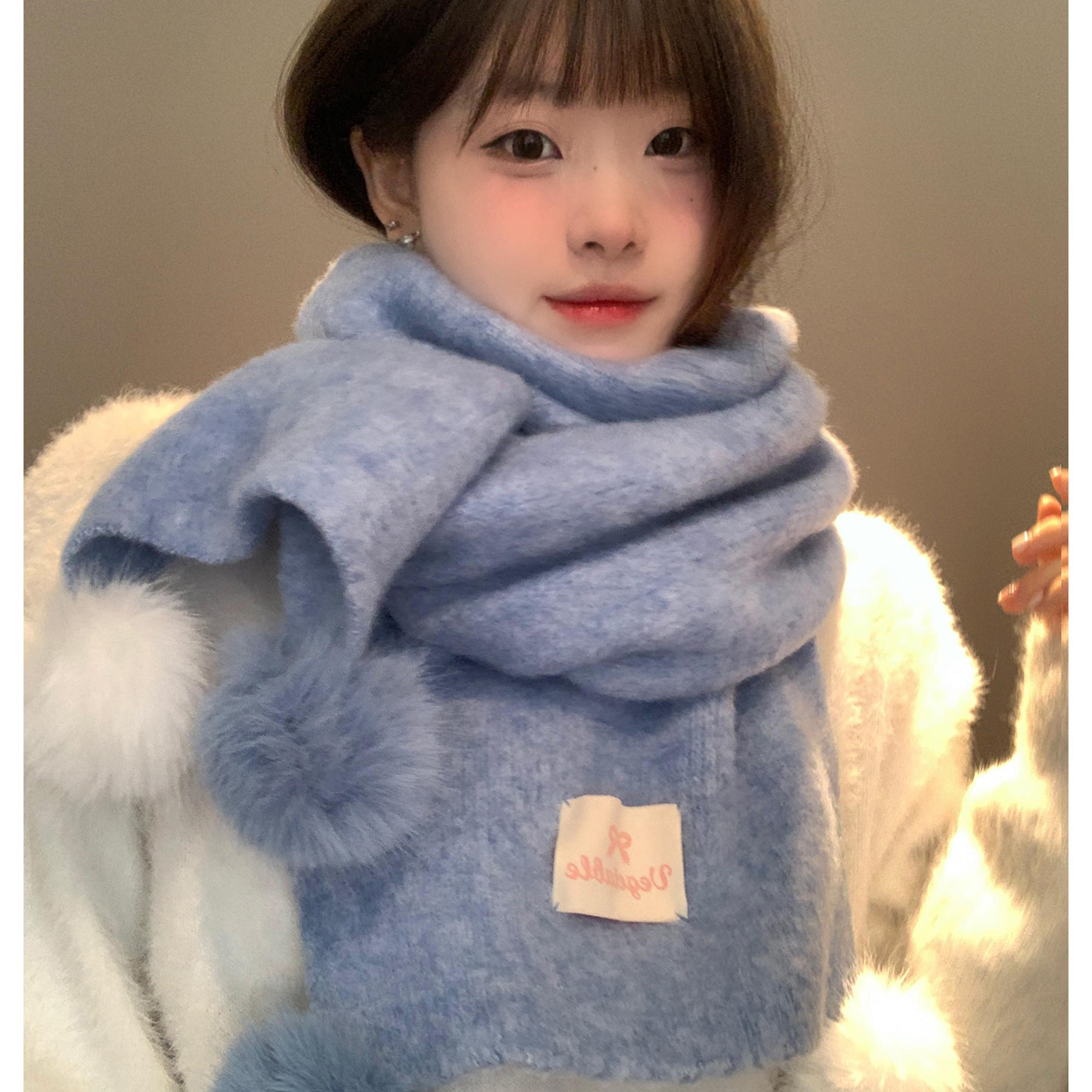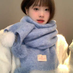 韩系氛围感软糯毛球蓝色围巾女秋冬加厚保暖防寒百搭针织围脖学生