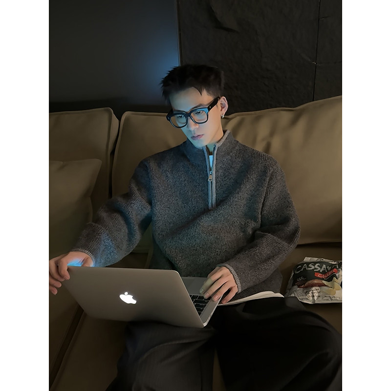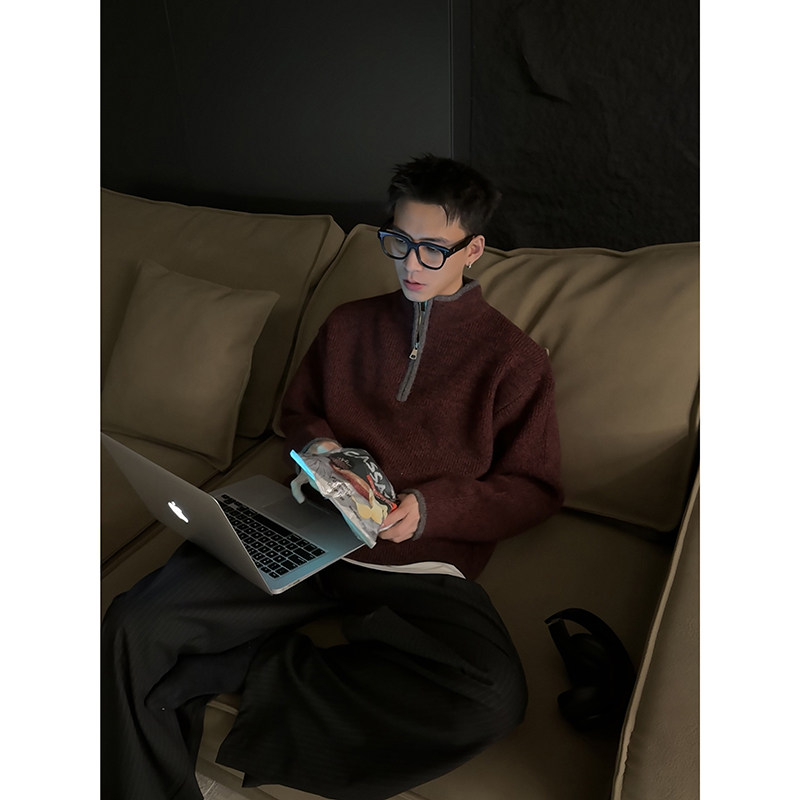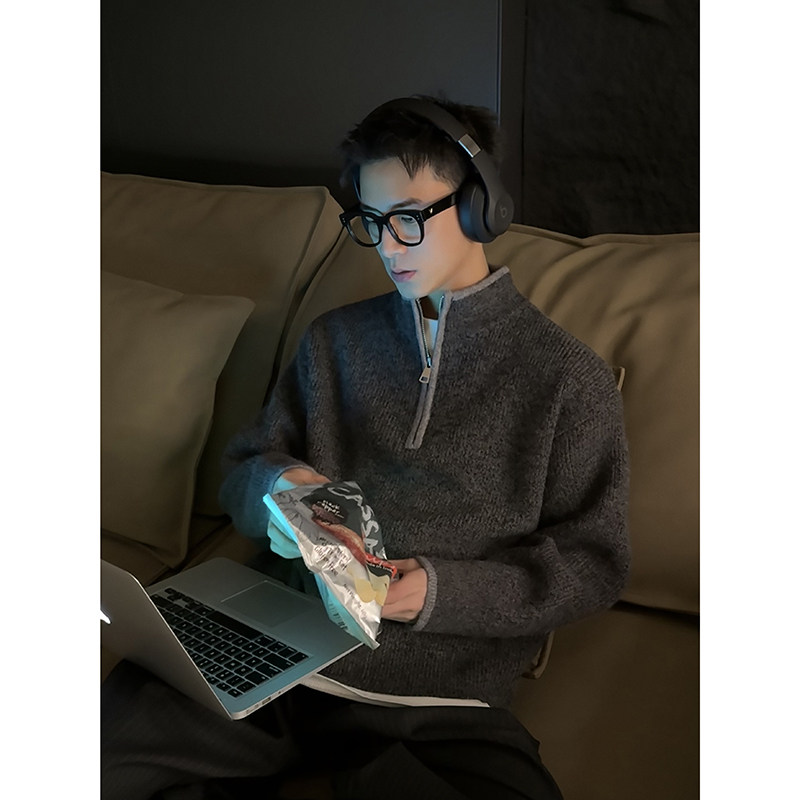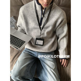 上衣 简约半拉链拼接撞色毛衣男宽松休闲秋冬百搭针织衫 PLTH 美式