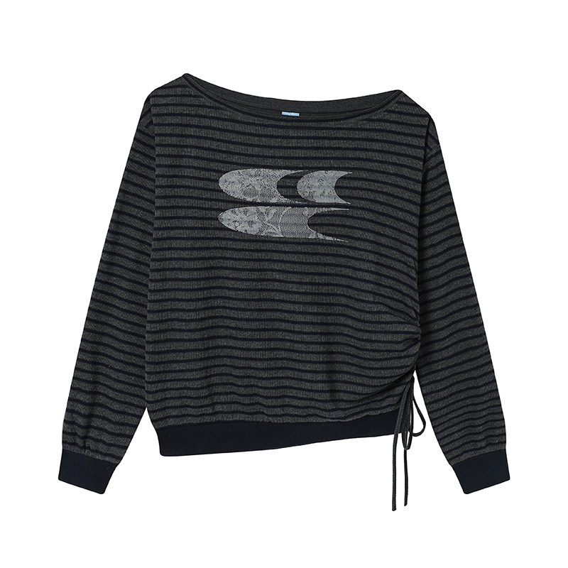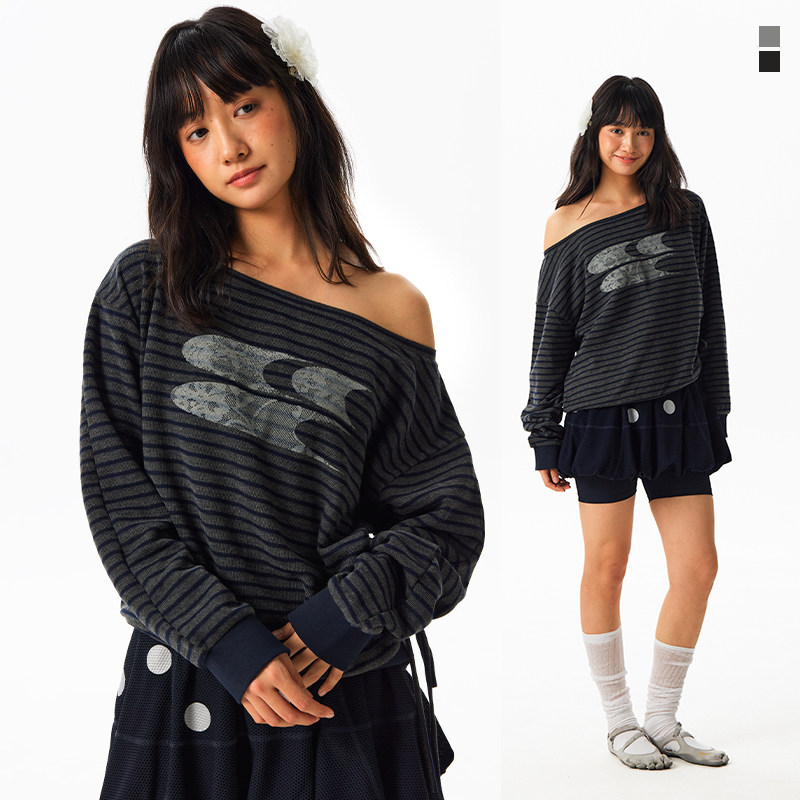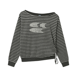 CryingCenter条纹撞色一字肩蕾丝月牙logo斜肩卫衣休闲长袖 女款