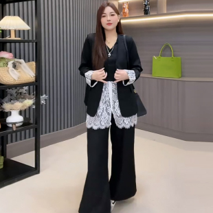 子套装 女装 胖mm2026春季 显瘦宽松大码 新款 蕾丝拼接马甲西服外套裤