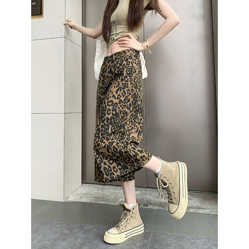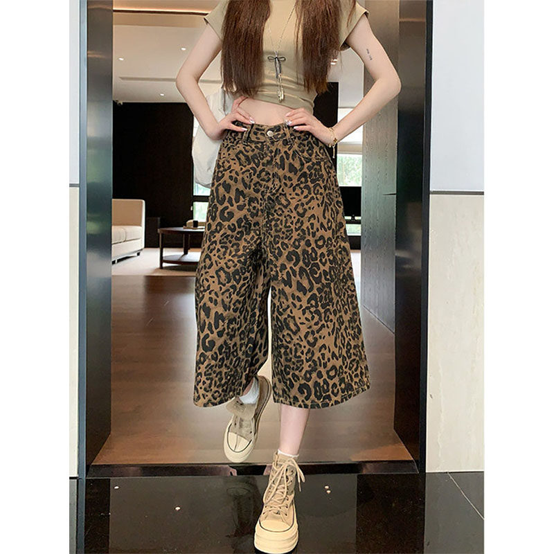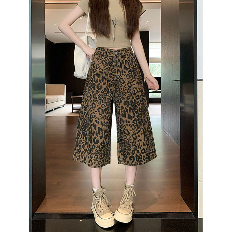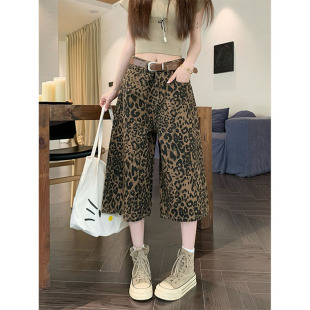 高街复古大码 豹纹显瘦高腰宽松阔腿裤 七分牛仔裤 新款 子 女夏季 美式