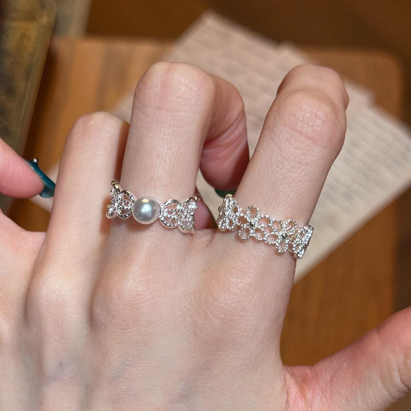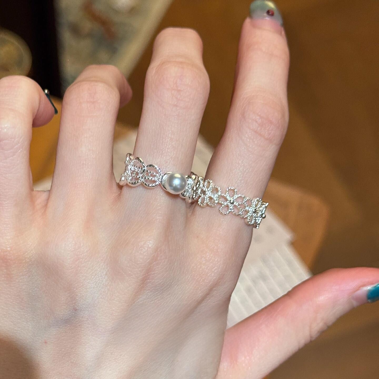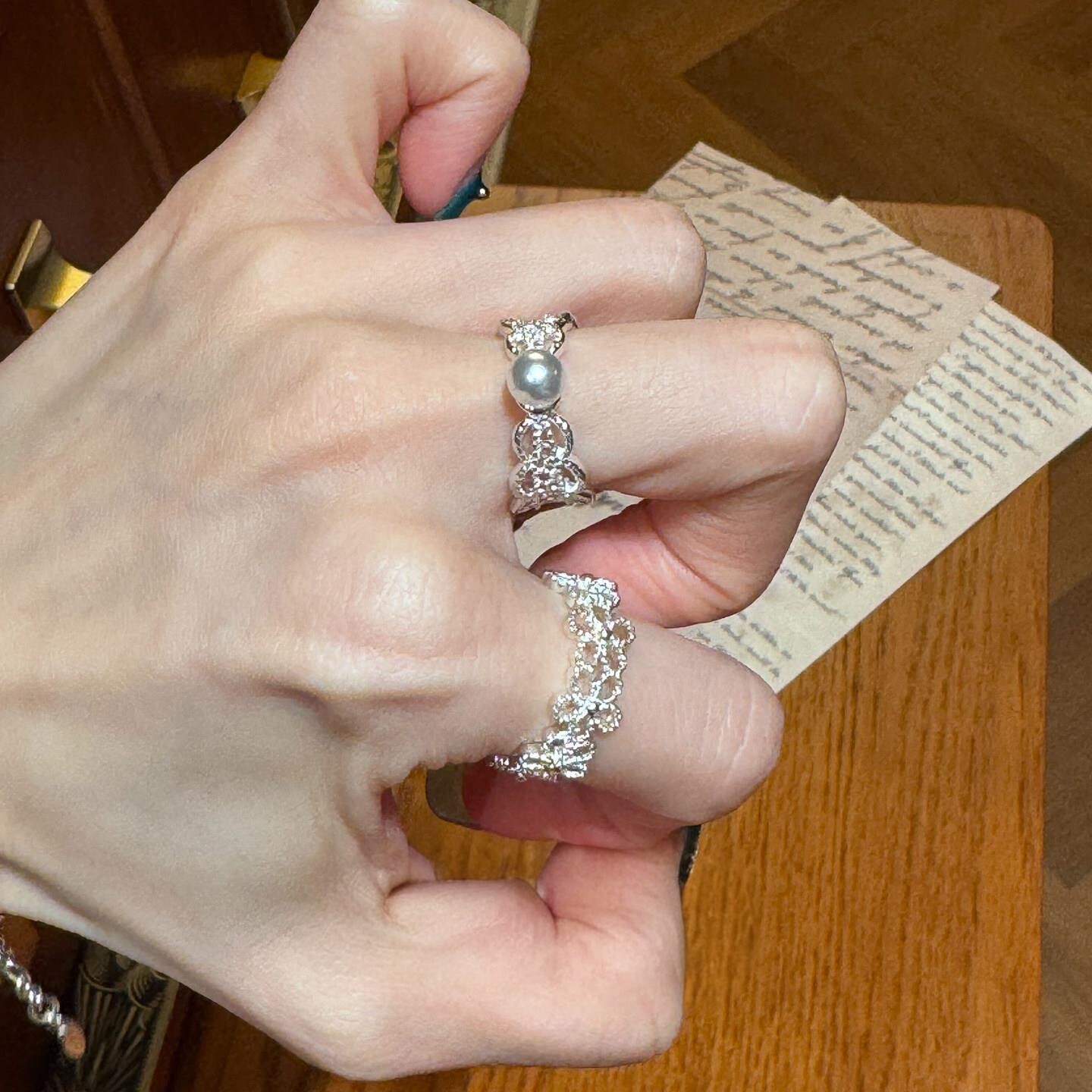 S925纯银叠戴光泽珍珠蕾丝边开口戒指女小众设计感镂空花花食指戒