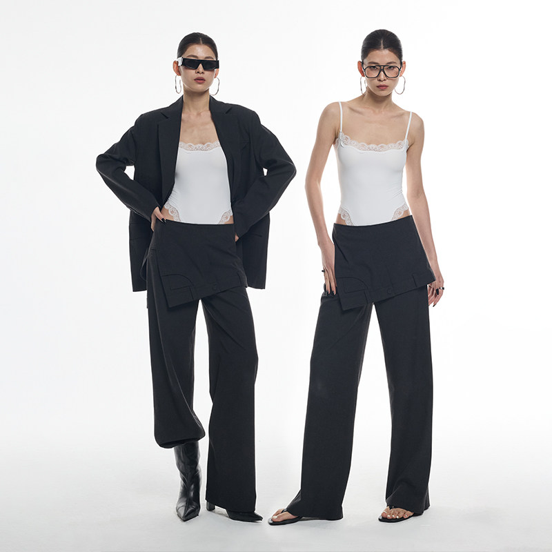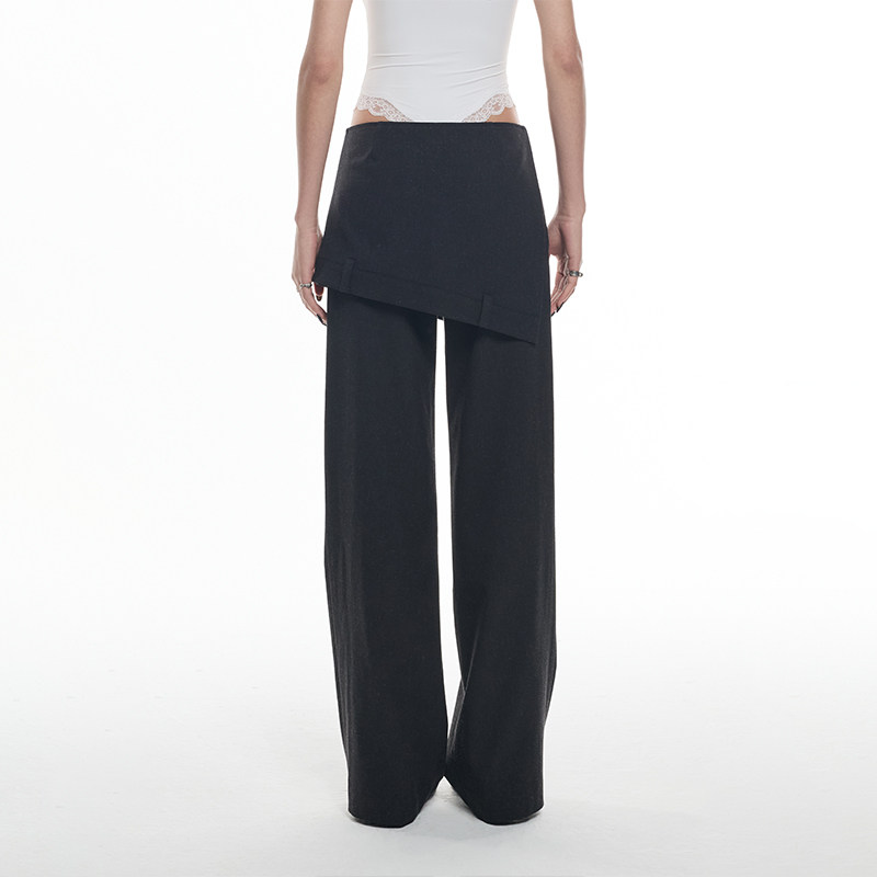 2026春 炭灰色梨形显瘦解构中腰垂坠直筒西裤 ourhour 假两件裙裤