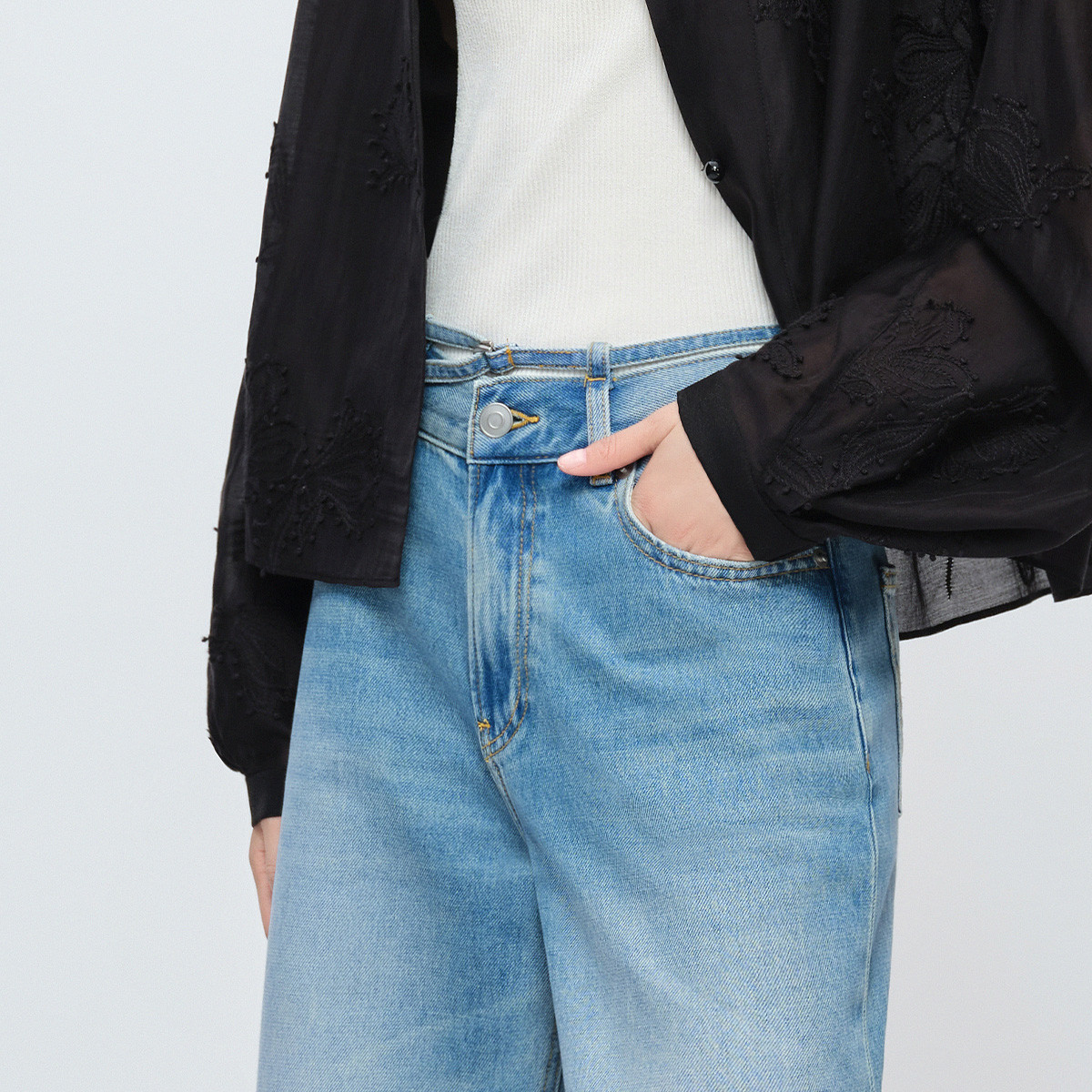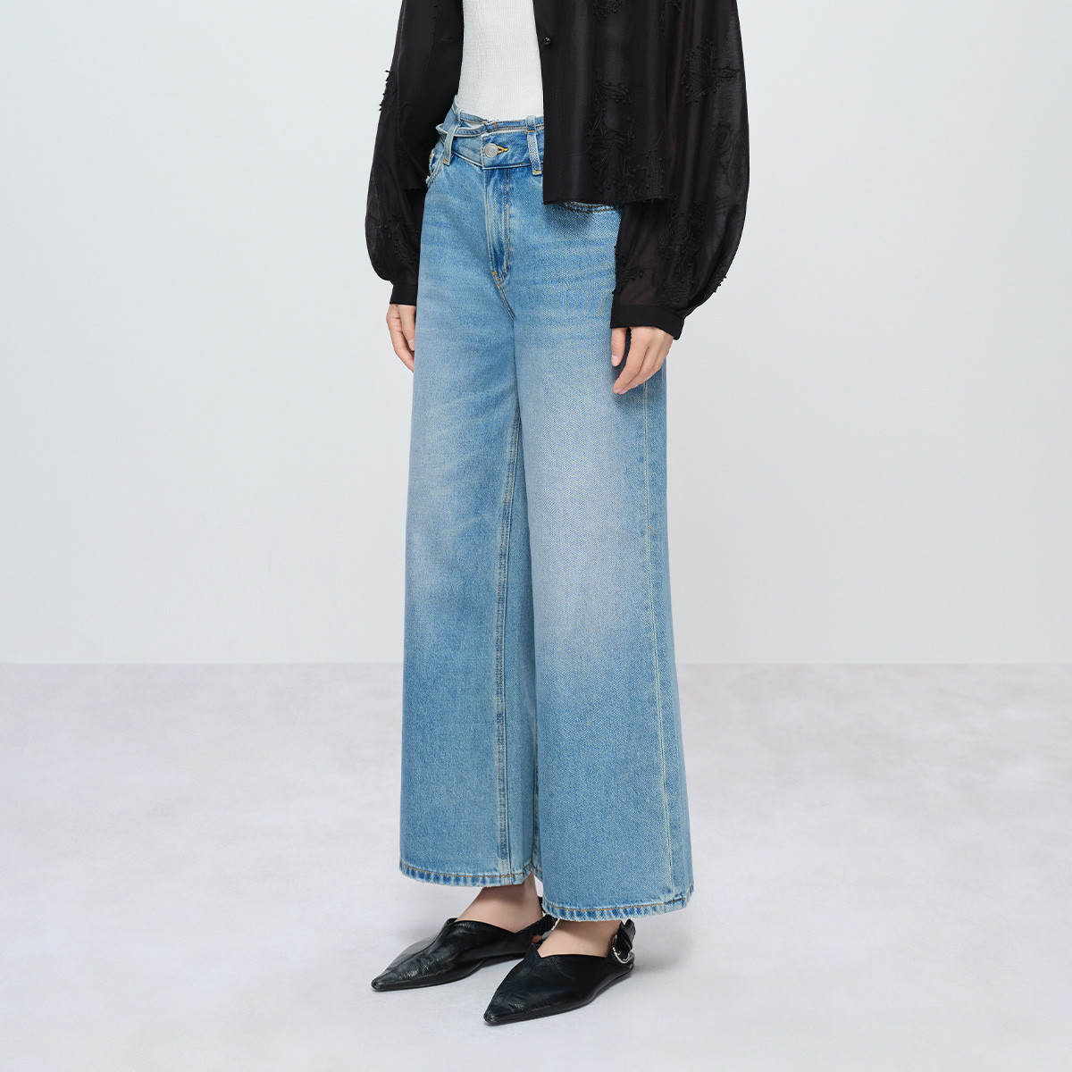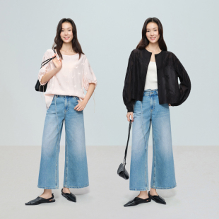 naivee26夏新款 通勤休闲设计感窄胯直腿显高八分阔腿水洗牛仔裤