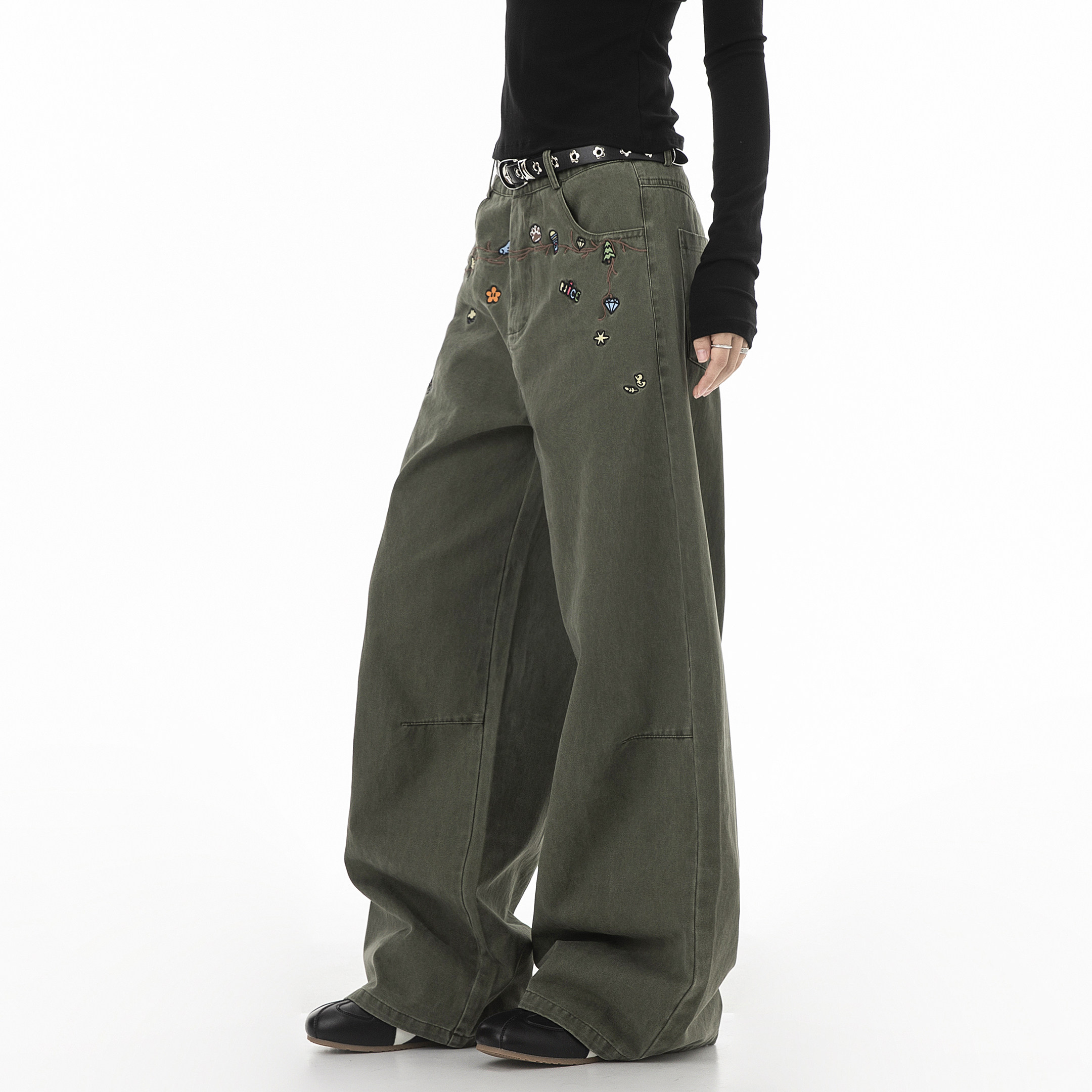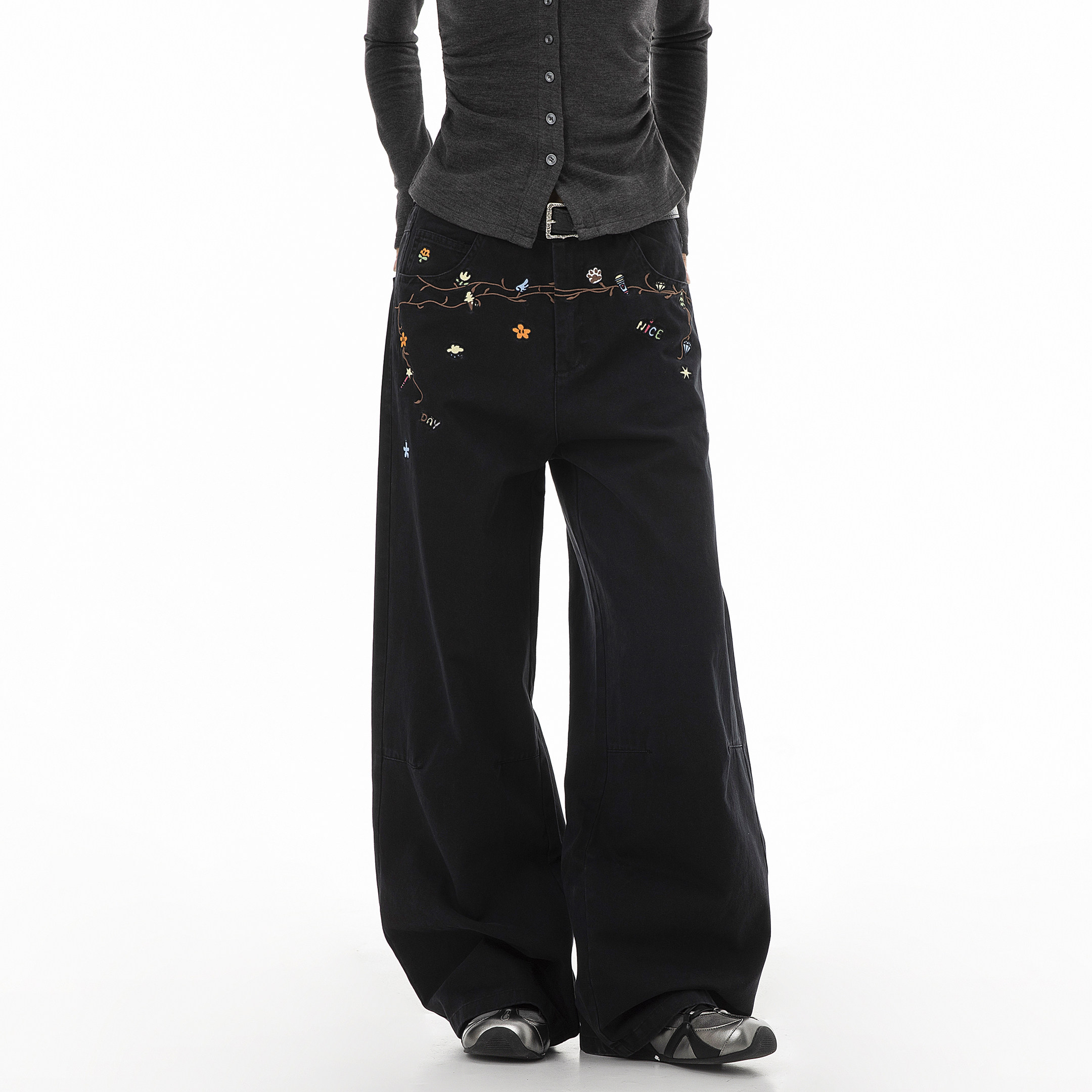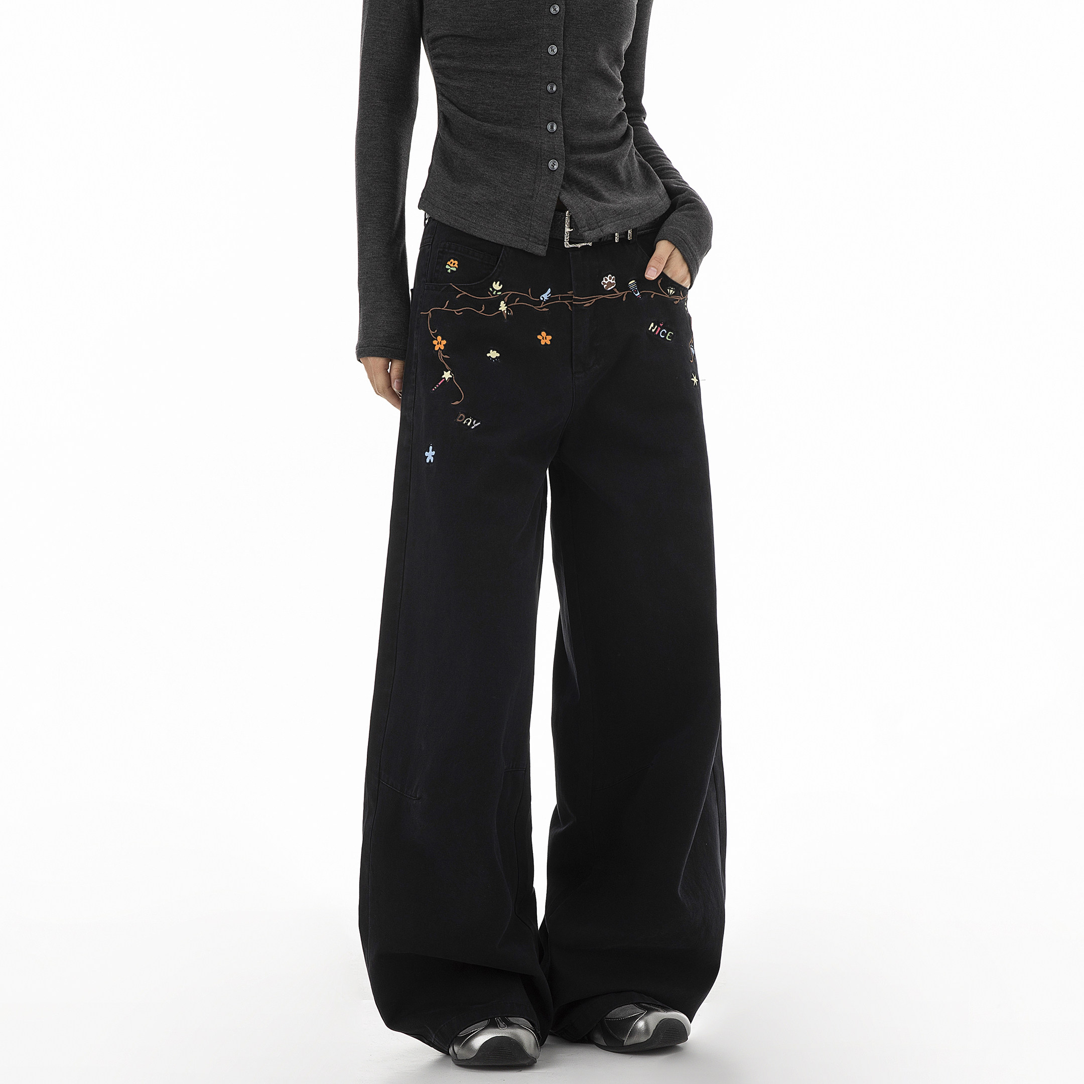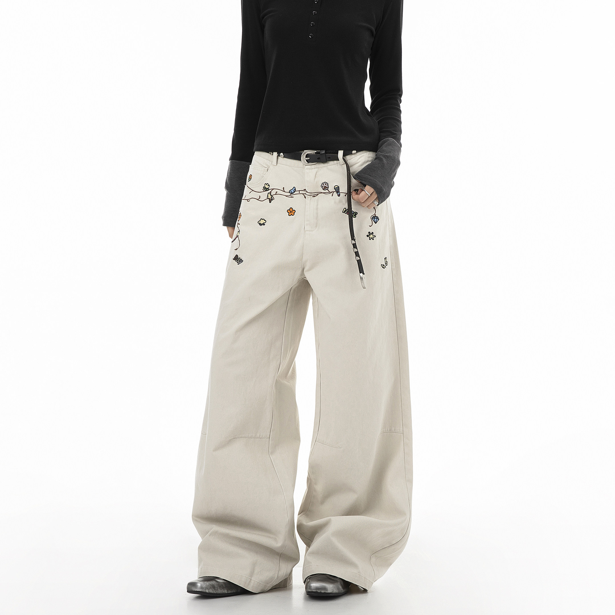 花卉刺绣休闲裤 女春季 裤 MODE 工装 美式 阔腿弯刀裤 ICH 宽松直筒裤