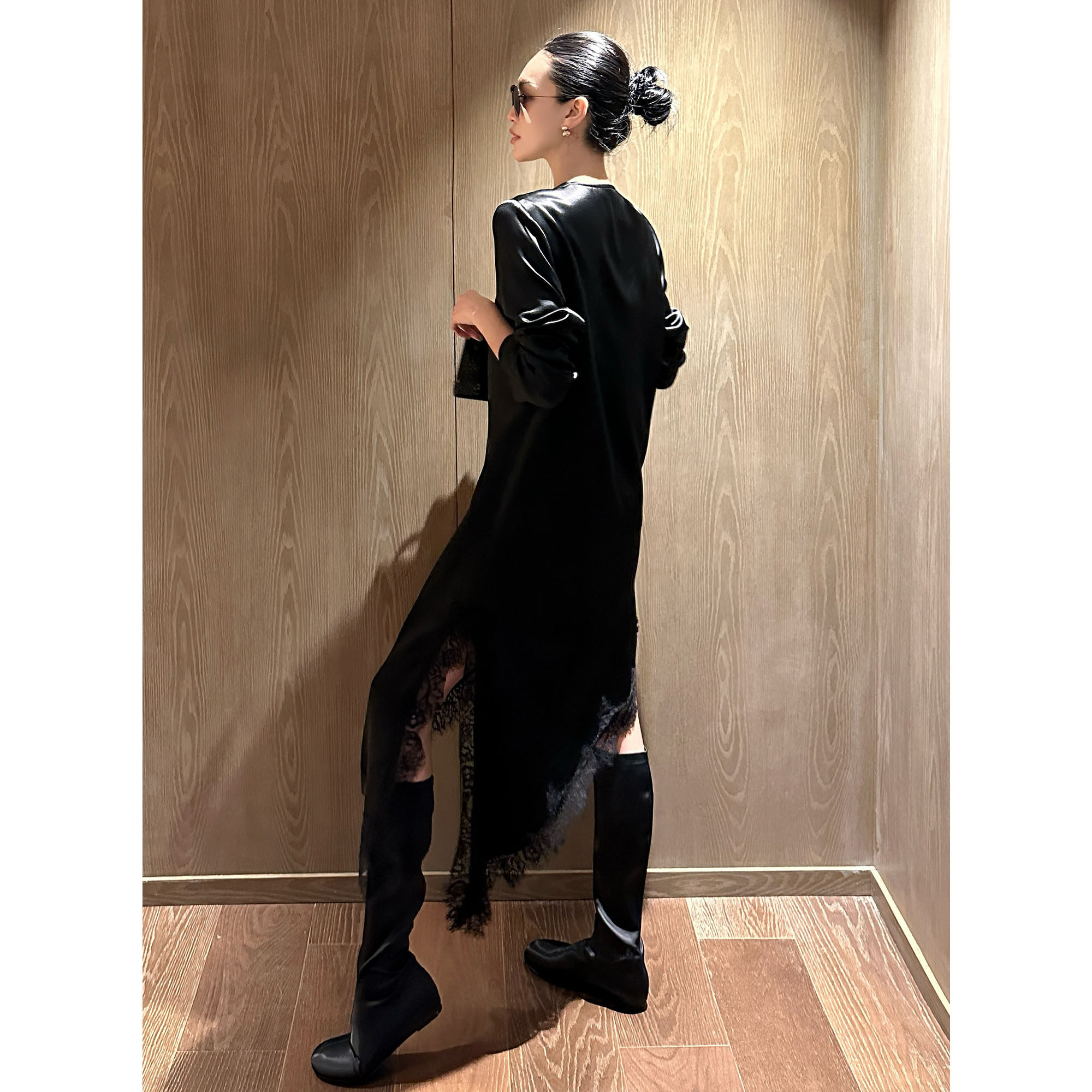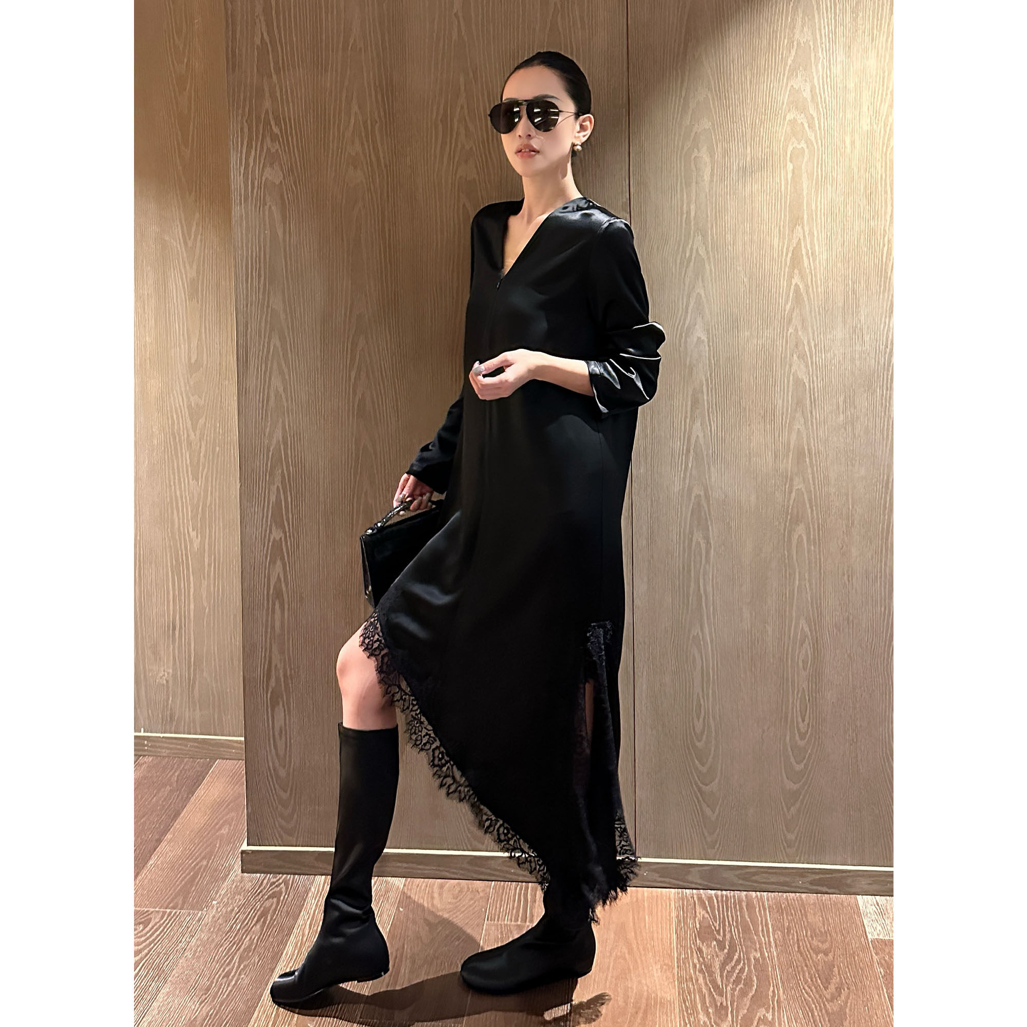 风采镂空之美递进层次蕾丝边连衣裙长袖 四季 v领裙 裁缝大师裙 AME