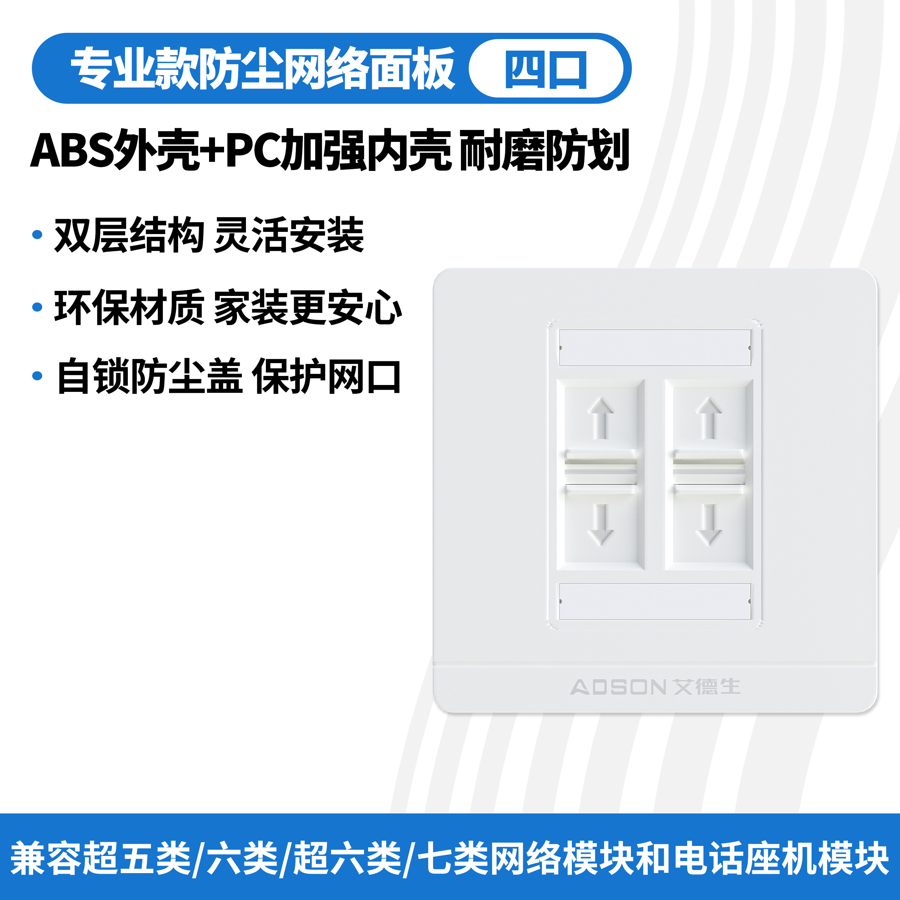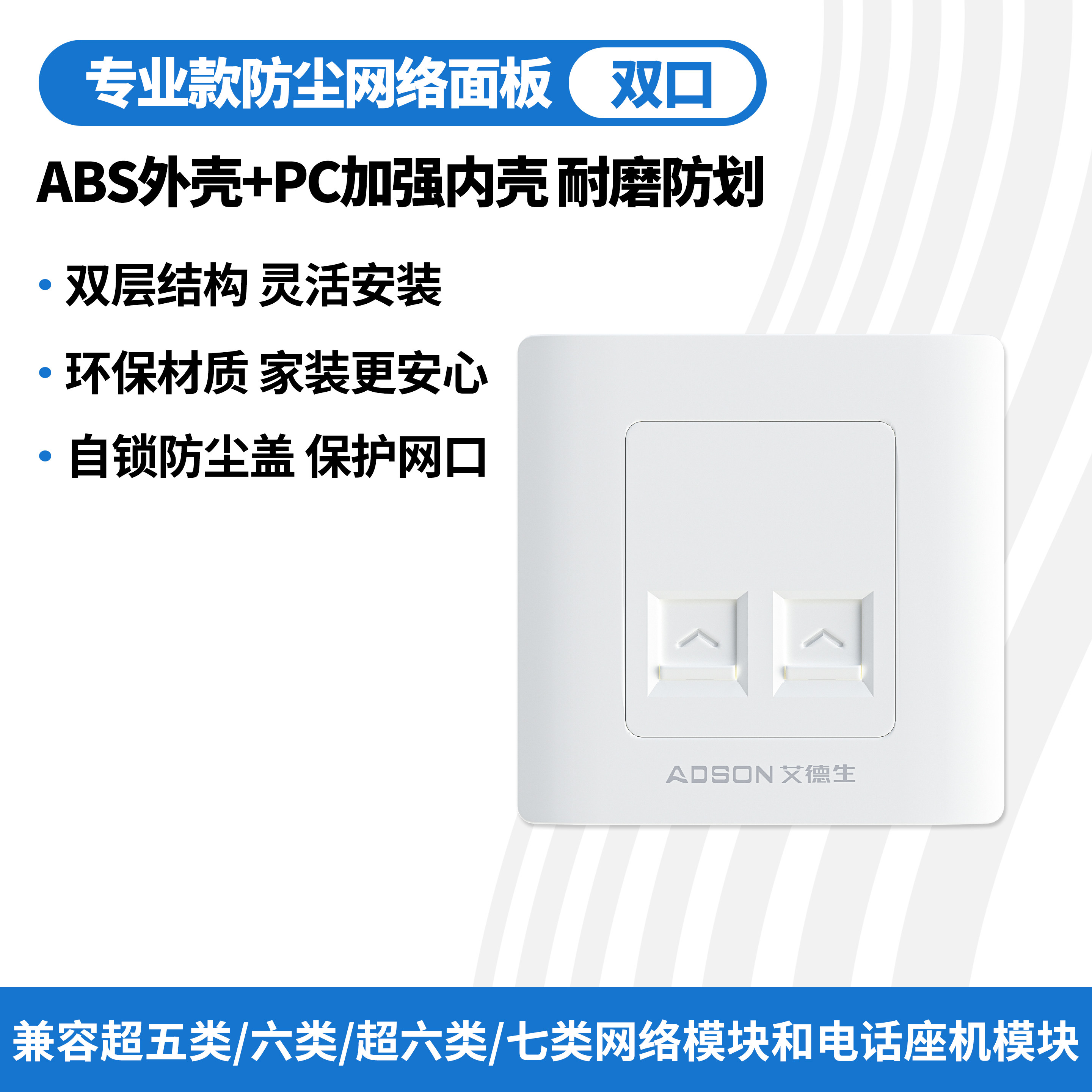 艾德生网线面板网络电脑插座86型超五六七八类千兆万兆信息模块双接口网线盒
