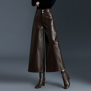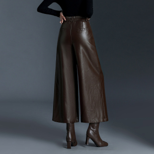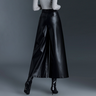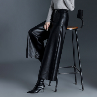 高腰显瘦宽松小个子休闲裤 秋冬新款 女皮裤 加绒加厚九分A字阔腿裤