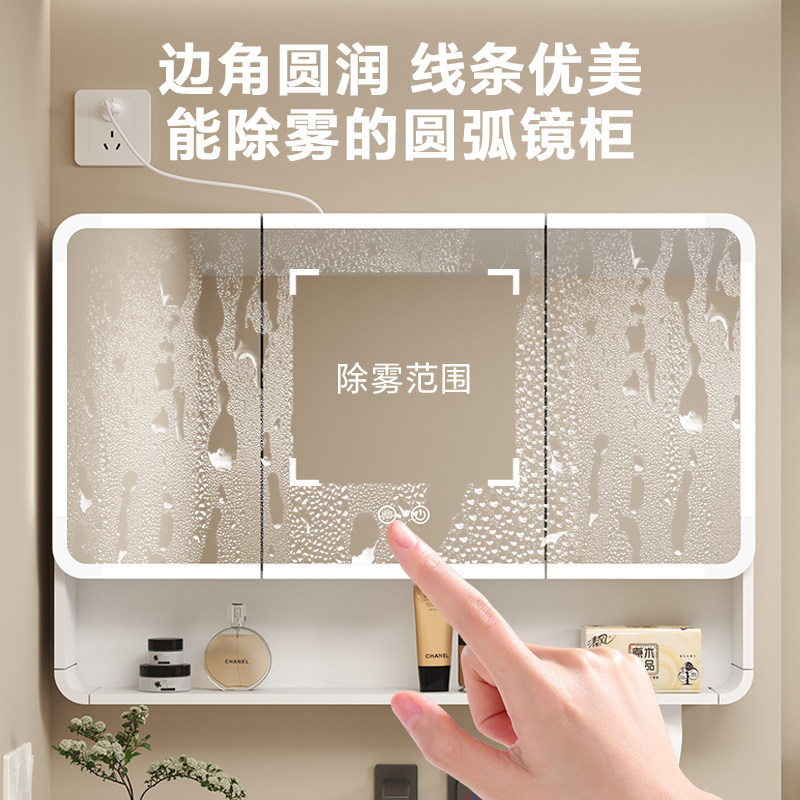 奶油太空铝圆弧浴室镜柜挂墙式 卫生间智能带灯带美妆收纳架储物柜