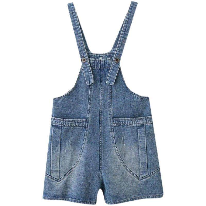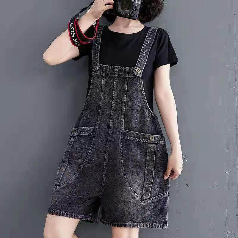 宽松休闲复古减龄阔腿五分裤 牛仔背带裤 新款 宽松夏季 潮 女韩版