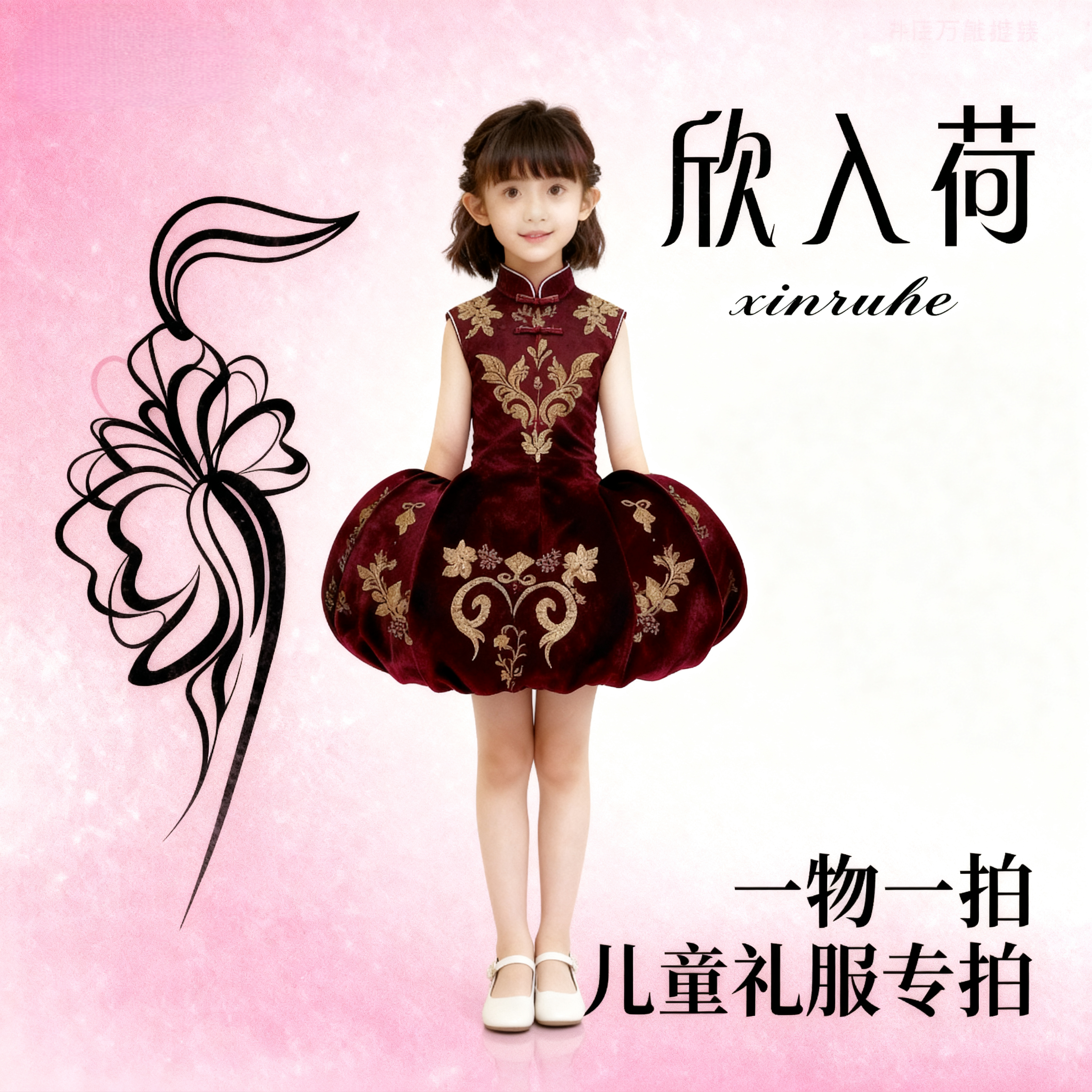 儿童礼服蓬蓬纱女童高端公主裙酒红色钢琴考级演出服女孩主持礼服