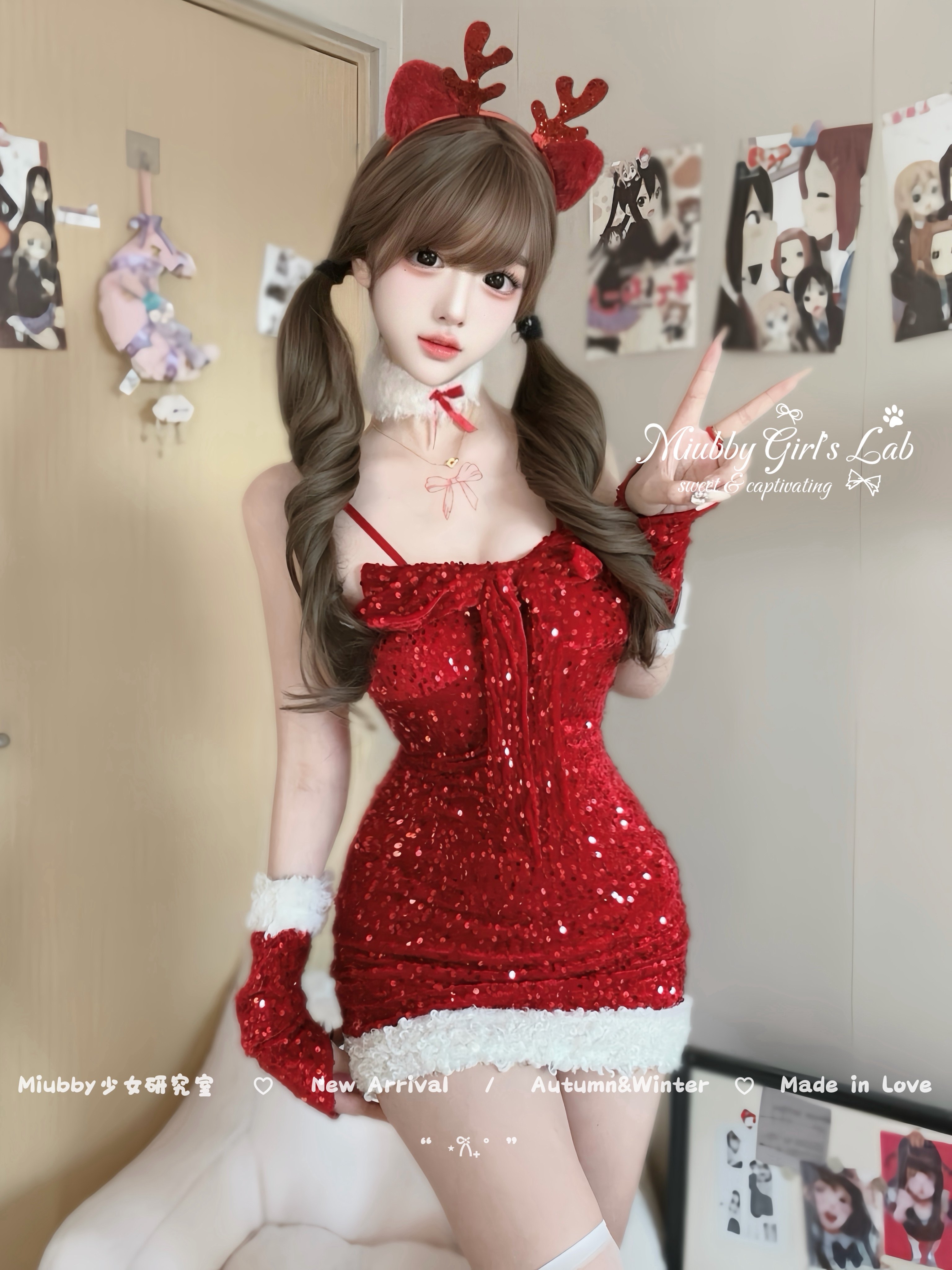 Miubby「麋鹿小姐」纯欲性感辣妹亮片圣诞套装 蝴蝶结气质包臀裙