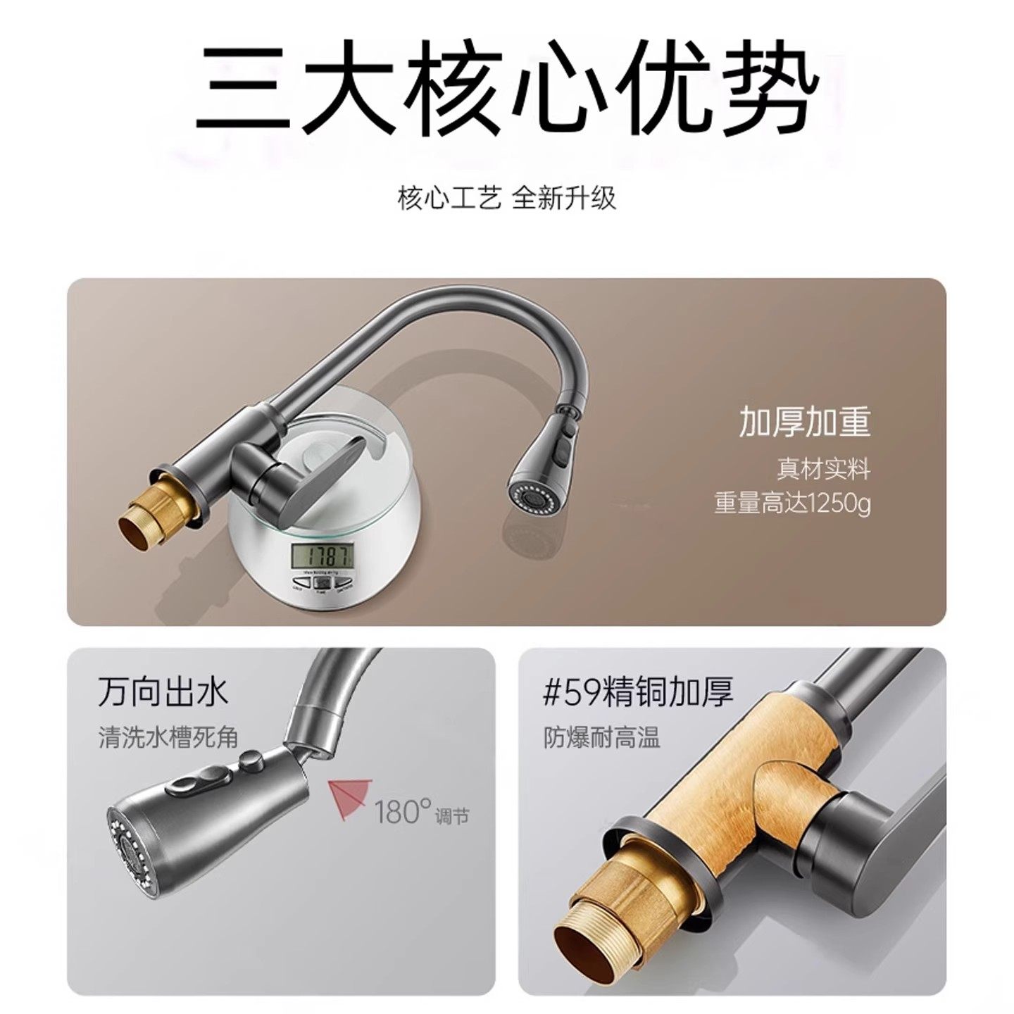 横式 全铜厨房水龙头洗菜盆洗碗池单冷家用旋转防溅水槽 万向入墙式