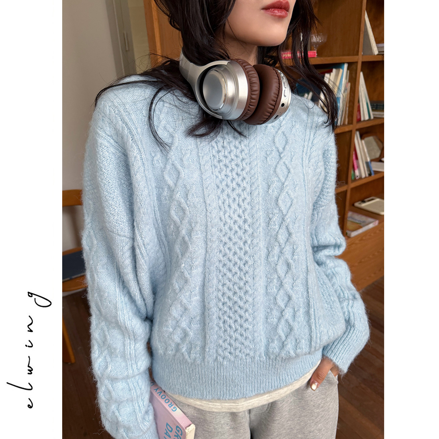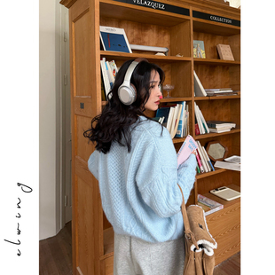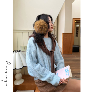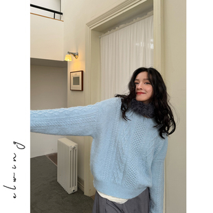 宽松毛衣 设计感冬季 Elwing原创蓝色麻花羊毛针织开衫 粗线落肩袖