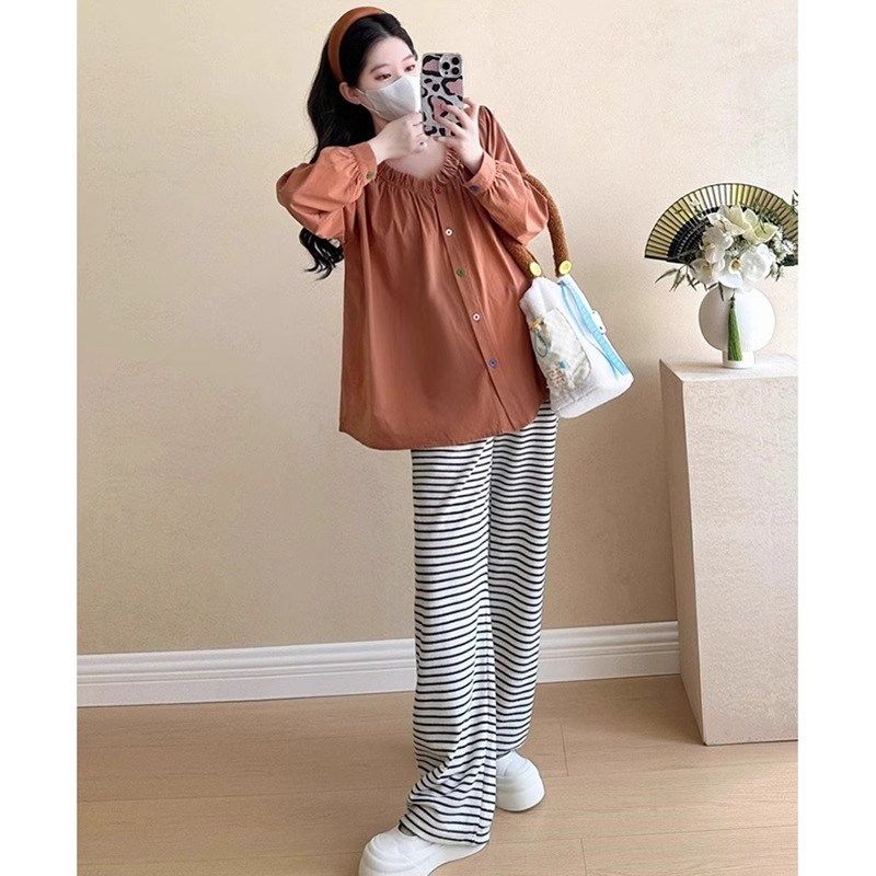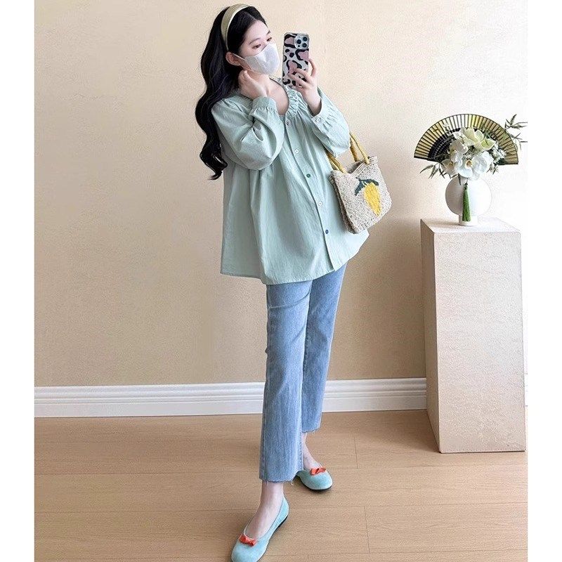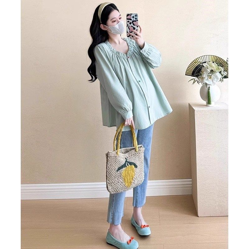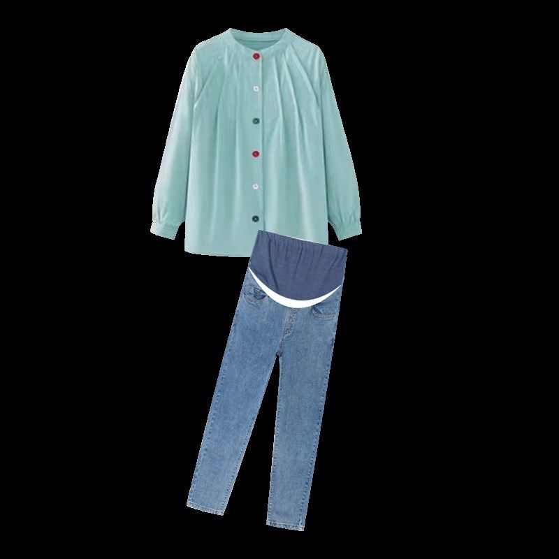 春秋2025新款 牛仔裤 时尚 娃娃衬衫 两件套 甜美宽松遮肚长袖 孕妇套装