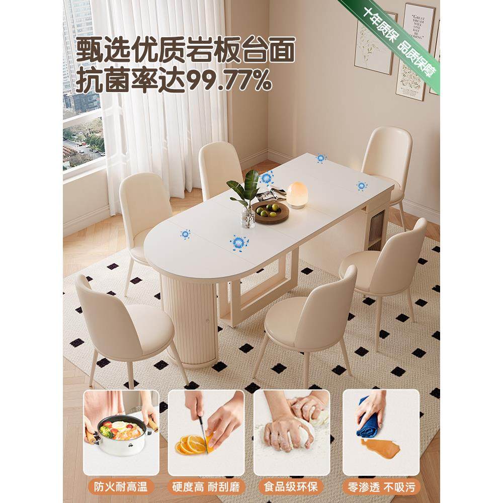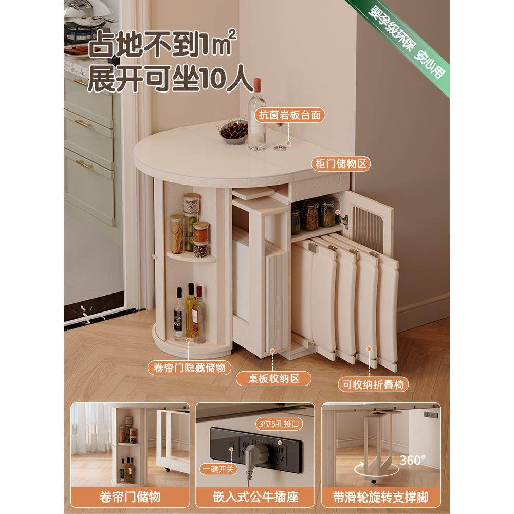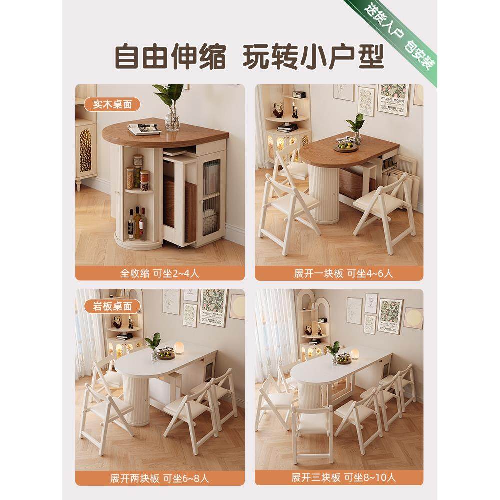 奶油风岩板伸缩餐桌小户型圆形家用实木可折叠两用省空间2025新款