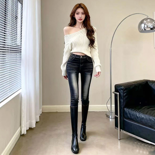 女水洗磨白高腰提臀铅笔裤 显腰细 复古高光丰胯黑灰色小脚牛仔裤