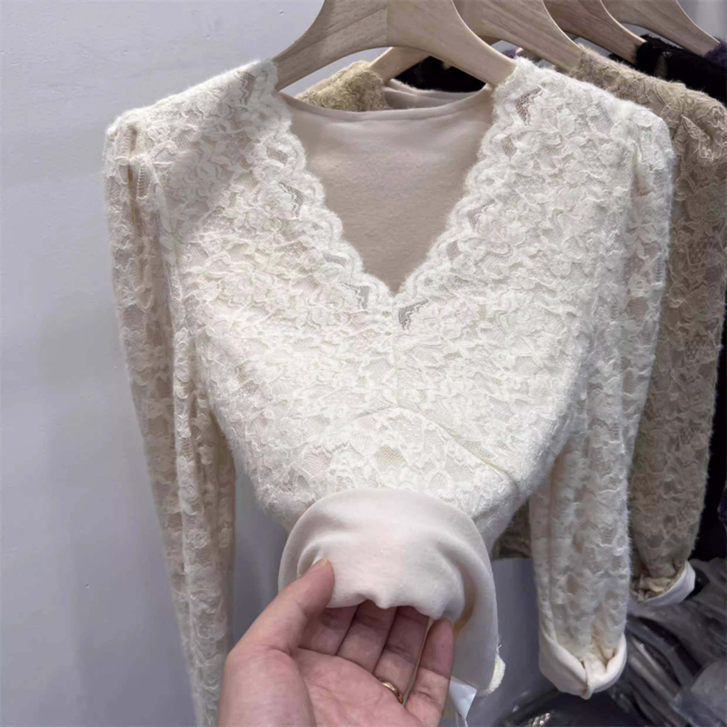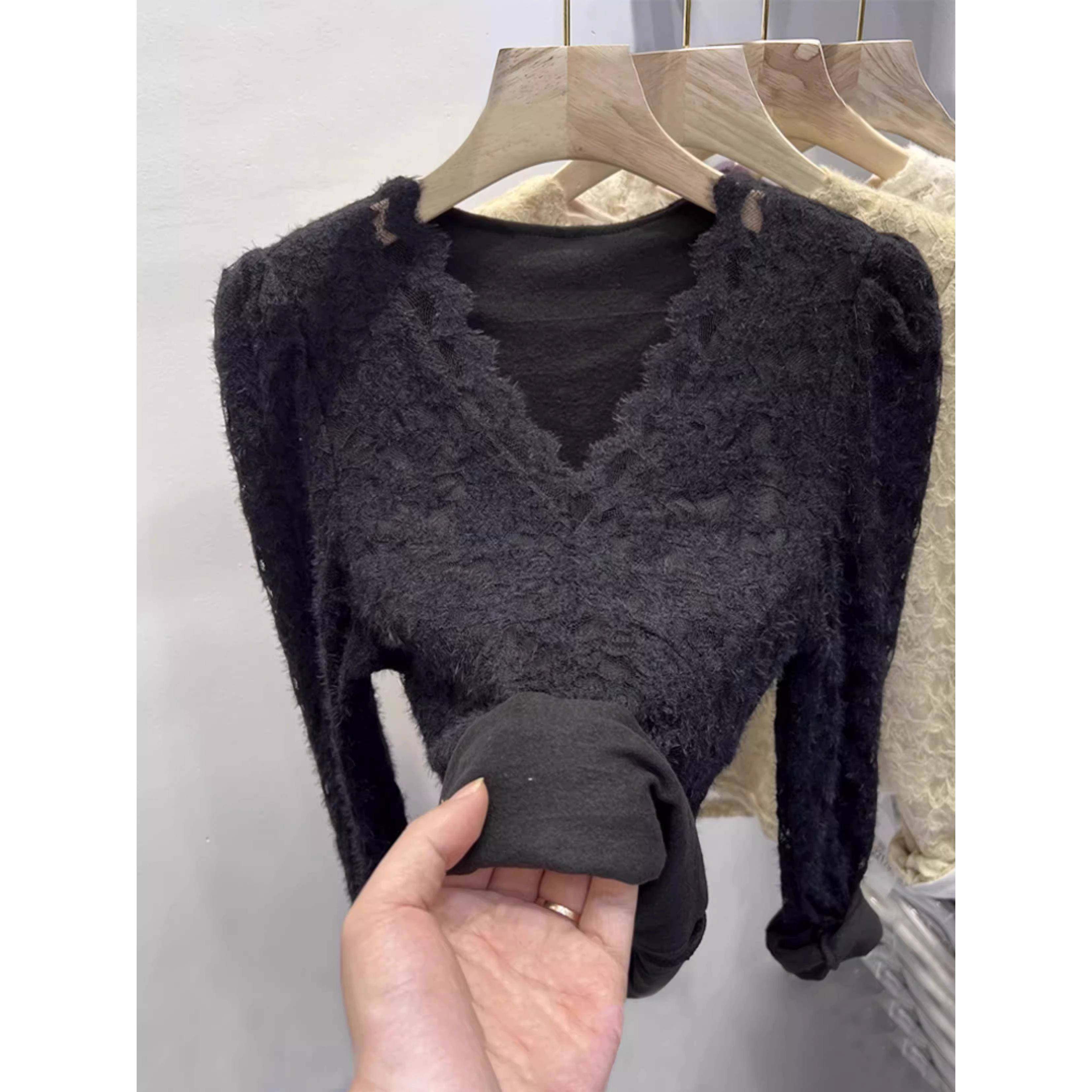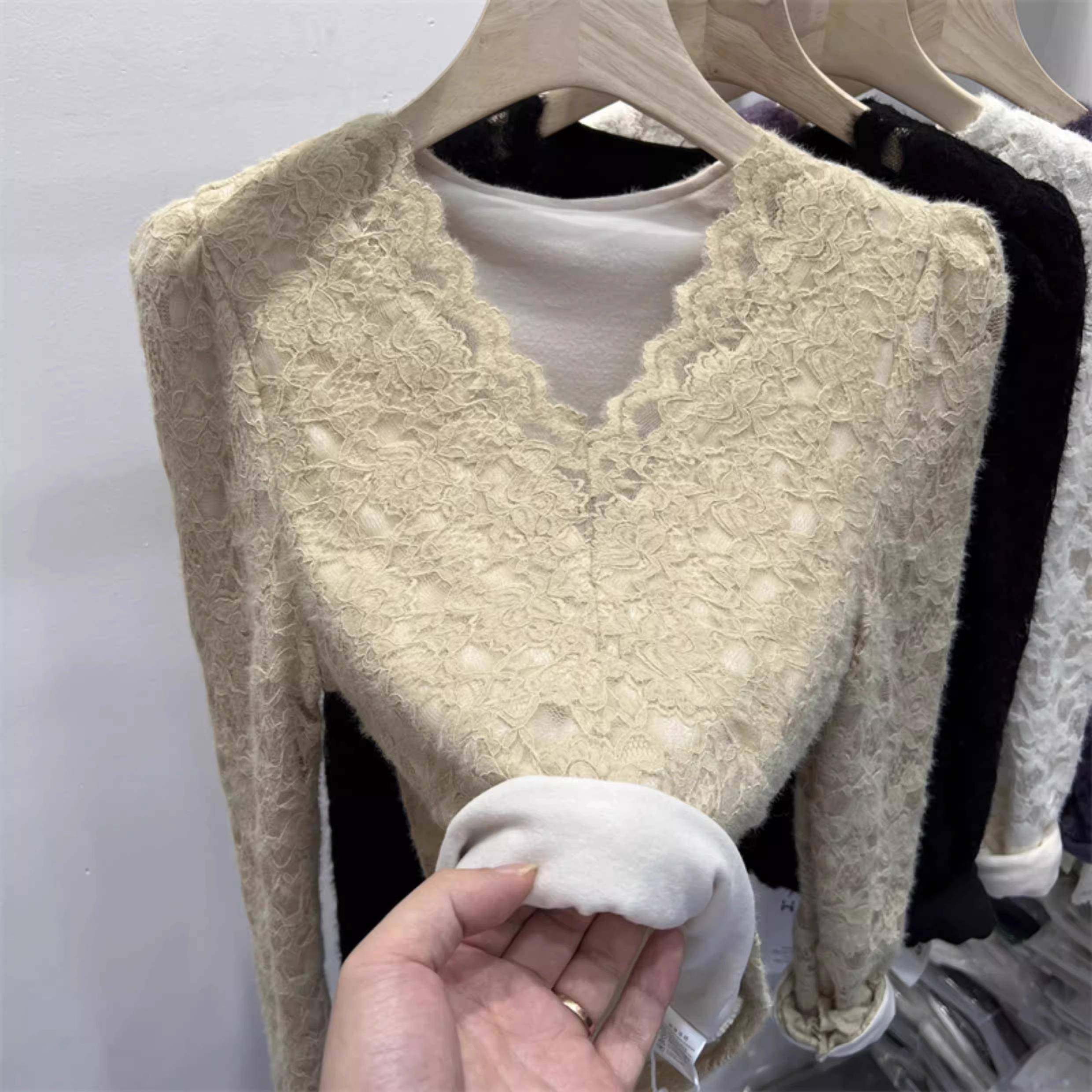 上衣1219e 内搭保暖修身 加绒加厚磨毛V领蕾丝打底衫 女秋冬季