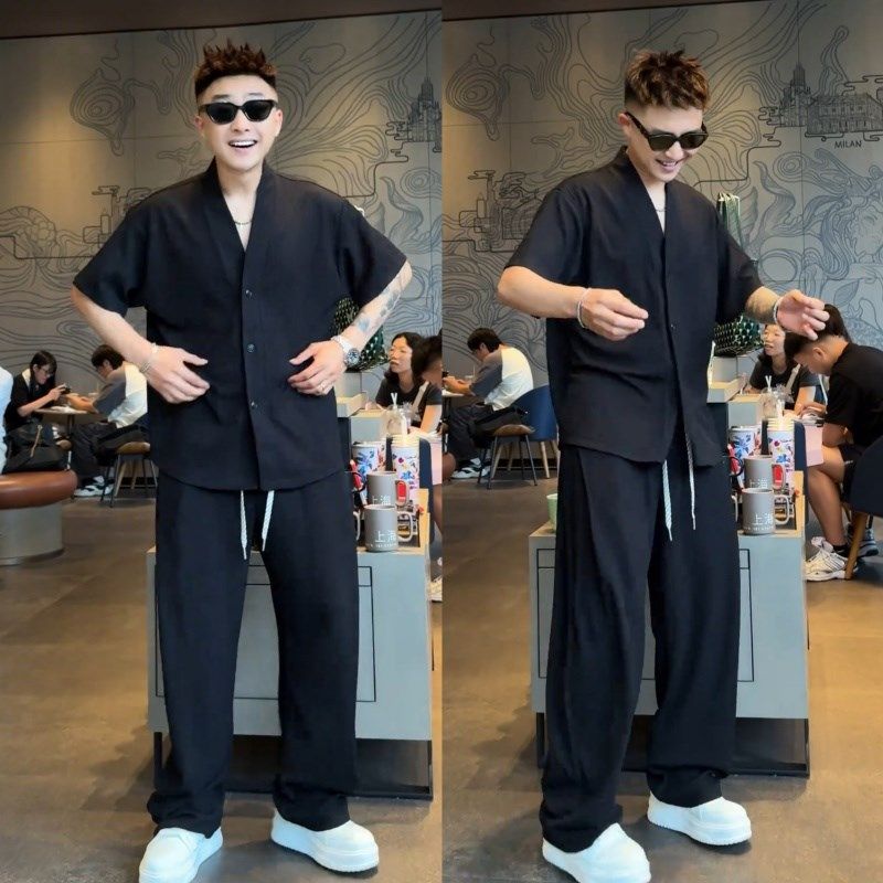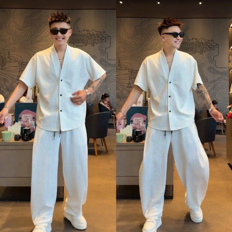 男士 极简风V领竖纹肌理感休闲套装 短袖 开衫 两件套 夏季 休闲裤 新款