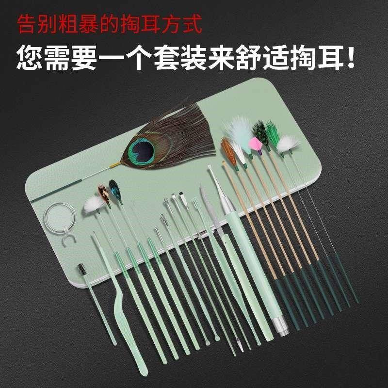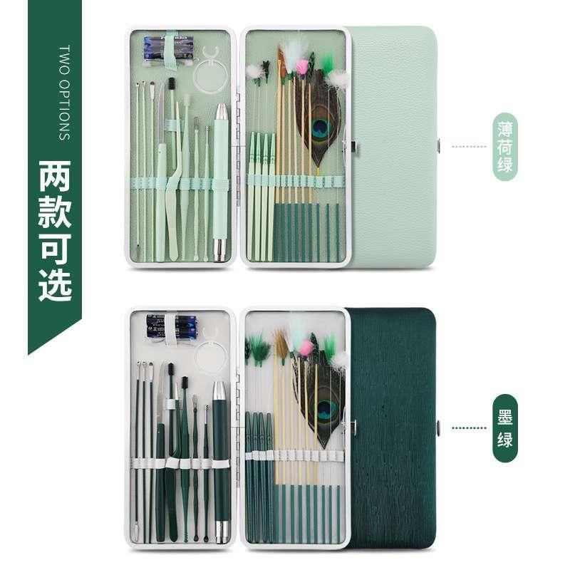 工厂带灯不锈钢螺旋采耳屎工具挖耳勺掏耳朵毛毛鹅毛棒镊子套装