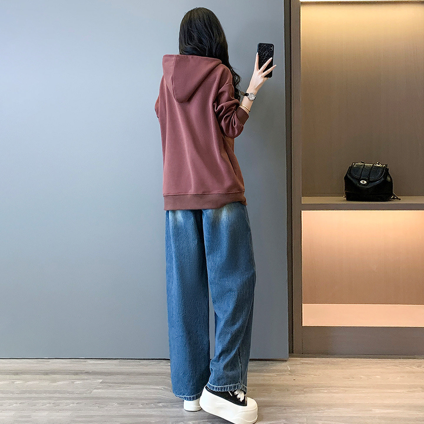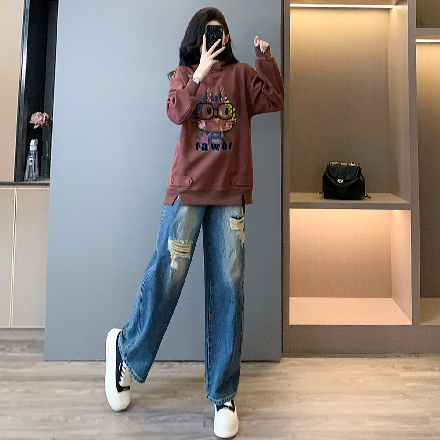 女春秋炸街破洞牛仔裤 韩版 套装 连帽卫衣时尚 两件套 卡通印花中长款