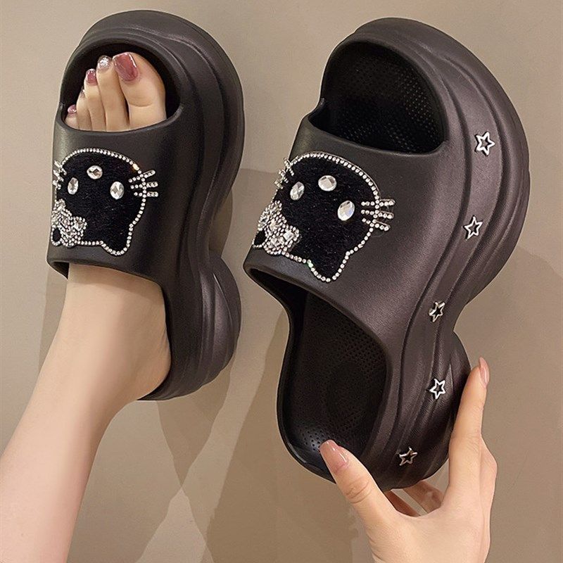 外穿可爱水钻猫咪室内家居防滑厚底凉拖鞋 高跟一字拖女士夏季 时尚