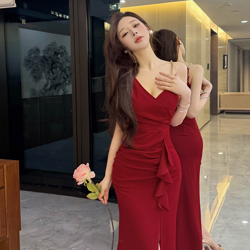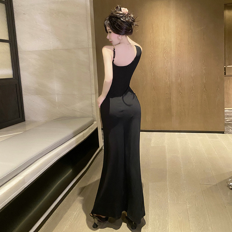 高级感晚礼服长裙复古气质斜肩吊带连衣裙高级开叉夜店公主风长裙